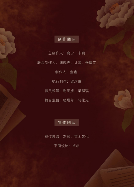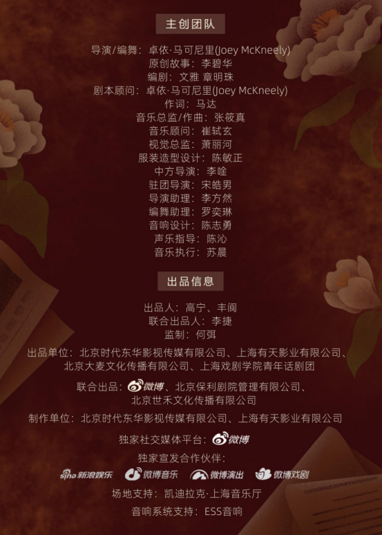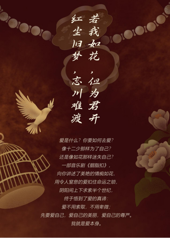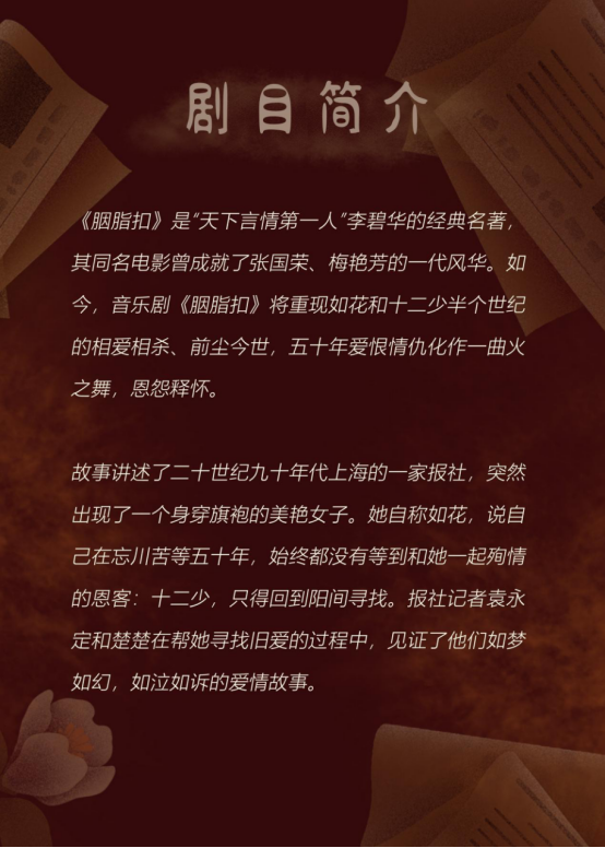 音乐剧《胭脂扣》改编自知名作家李碧华同名经典小说,集结了导演卓依·马可尼里、编剧文雅&章明珠、作曲张筱真、作词马达、造型设计陈敏正、视觉总监&灯光舞美设计萧丽河等国内外顶尖的主创团队共同打造