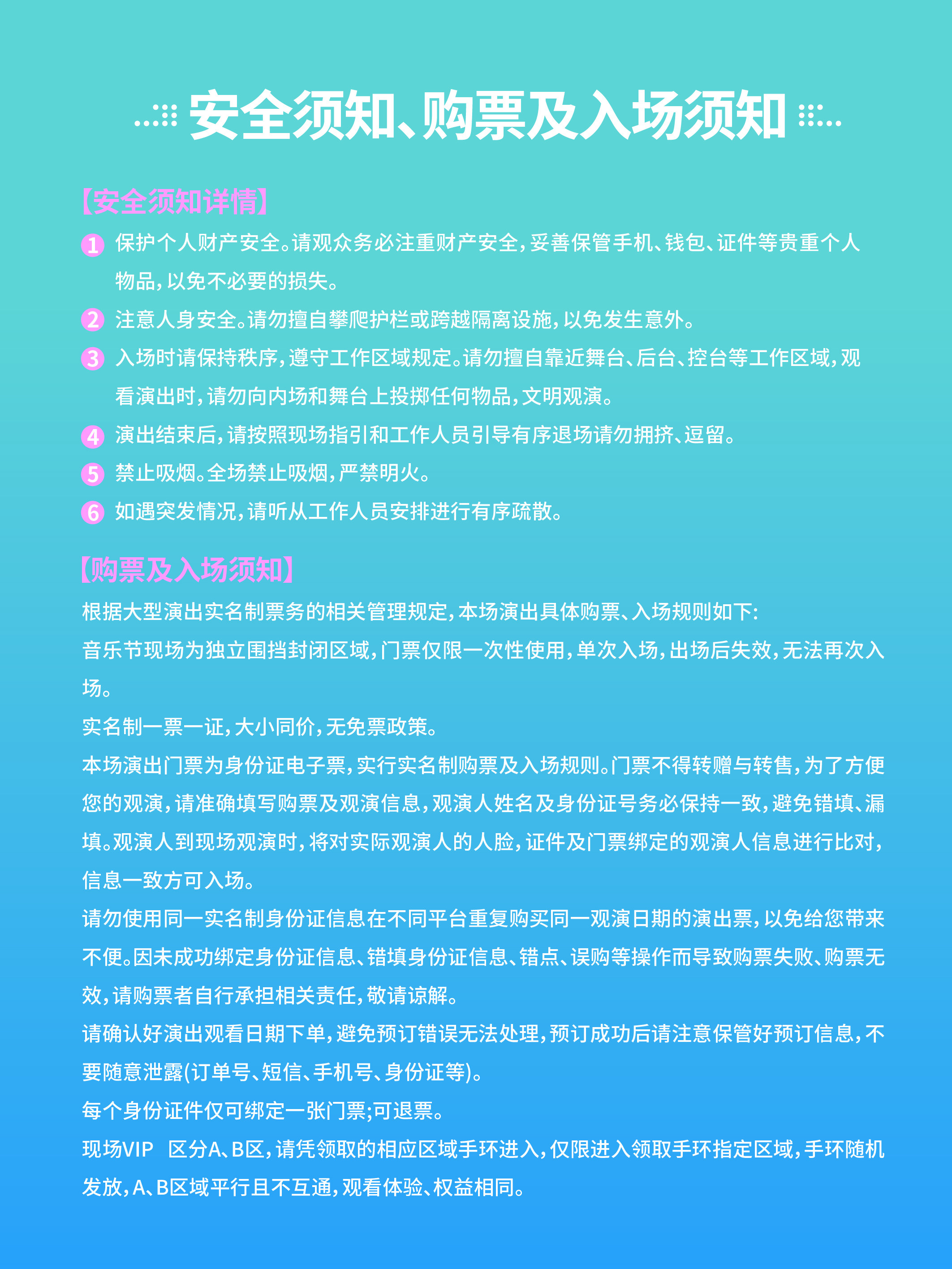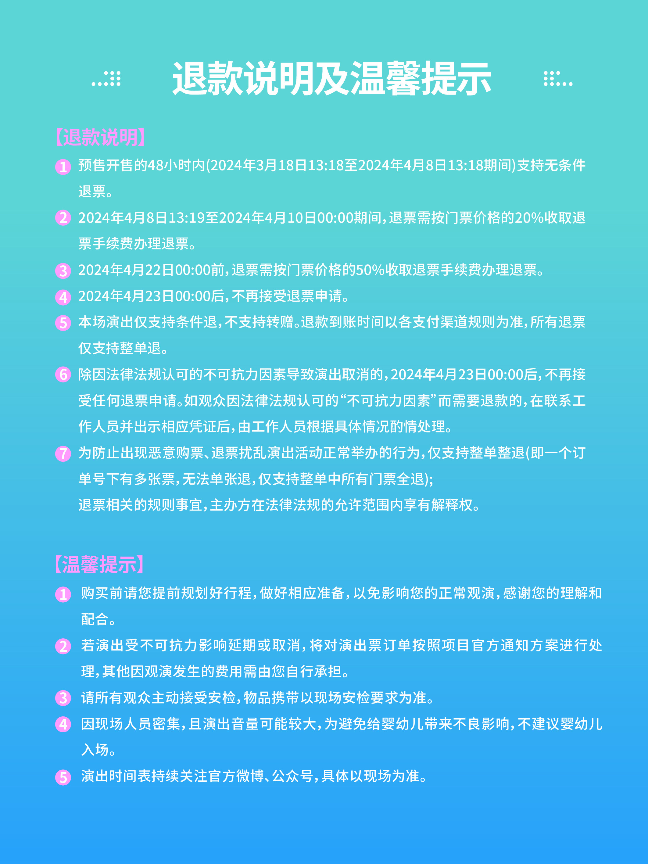 1.演出票品为特殊商品,除不可抗力因素导致演出取消外,订单不支持退换,可在平台转售; 2.演出详情仅供参考,具体以主办方公布信息及现场为准,请准时到场以免错过演出; 3.有票官方确保售出票品真实有效,请放心购买; 4.根据演出火爆情况,有票平台可能会将您所选的快递送票、上门自取等取票方式调整为现场取票,敬请谅解; 5.平台会尽力促使卖家履行交易协议,如果卖家付票过程中发生问题,本平台可协调相同或更高票挡的票品代替,否则平台将全额退款并按订单上约定的赔付方式与金额向用户进行赔付; 6.为了安全起见需要本人签收,演出快递票均为快递费到付(不包邮),请知晓!