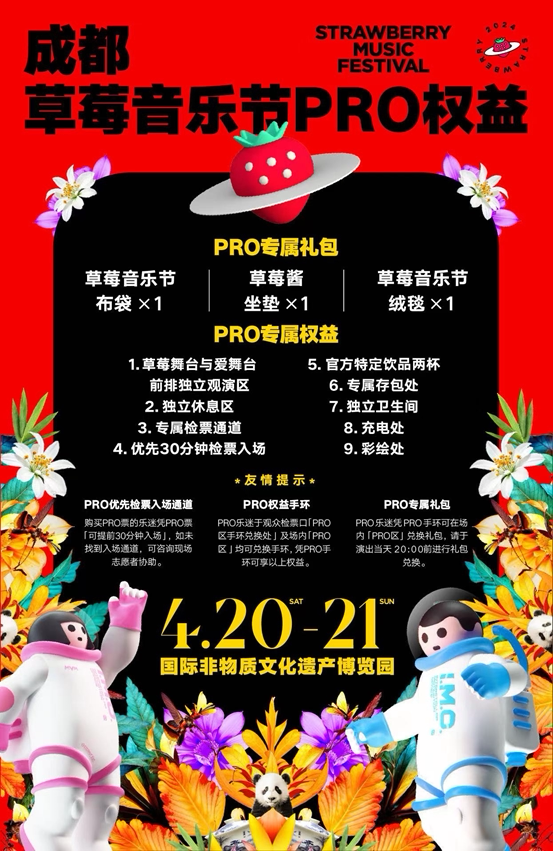 PRO单日票658元 ;含音乐节单日门票1张,以及专属礼包、专属权益。(专属礼包:草莓音乐节布袋*1、草莓酱坐垫*1、草莓音乐节绒毯*1;专属权益:前排独立观演区、独立休息区、专属检票通道、优先15分钟检票入场、官方特定饮品两杯、专属存包处、独立卫生间、充电处、彩绘处。)
