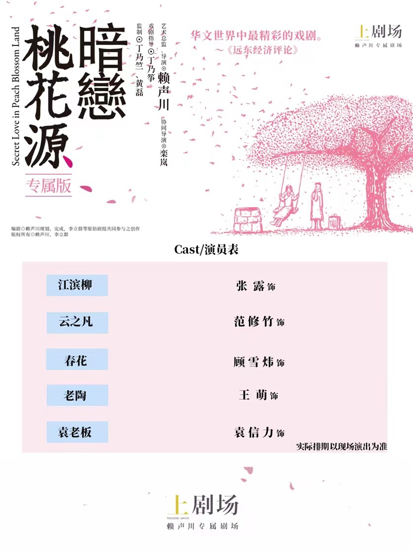 2017年,由赖声川亲自培养的上剧团坚强阵容出演的《暗恋桃花源》专属版在上剧场诞生,无论春夏秋冬,《暗恋桃花源》专属版连年上演,吸引无数观众走进剧场,被誉为“一张上海的戏剧名片。”专属版的驻场使更多人能够随时在繁华的市中心觅得一隅“戏剧桃花源”,也让拖着行李箱来上海的观众能够如愿以偿地看一出赖声川经典。