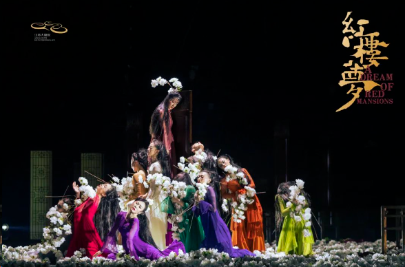 十二钗褪去华服,身着纯色长裙。端坐在形似墓碑的座椅上,神情冷漠,而后披肩散发起舞,仿佛在奋力挣扎,向上攀爬。最终,跃入花海,仿佛被埋葬。