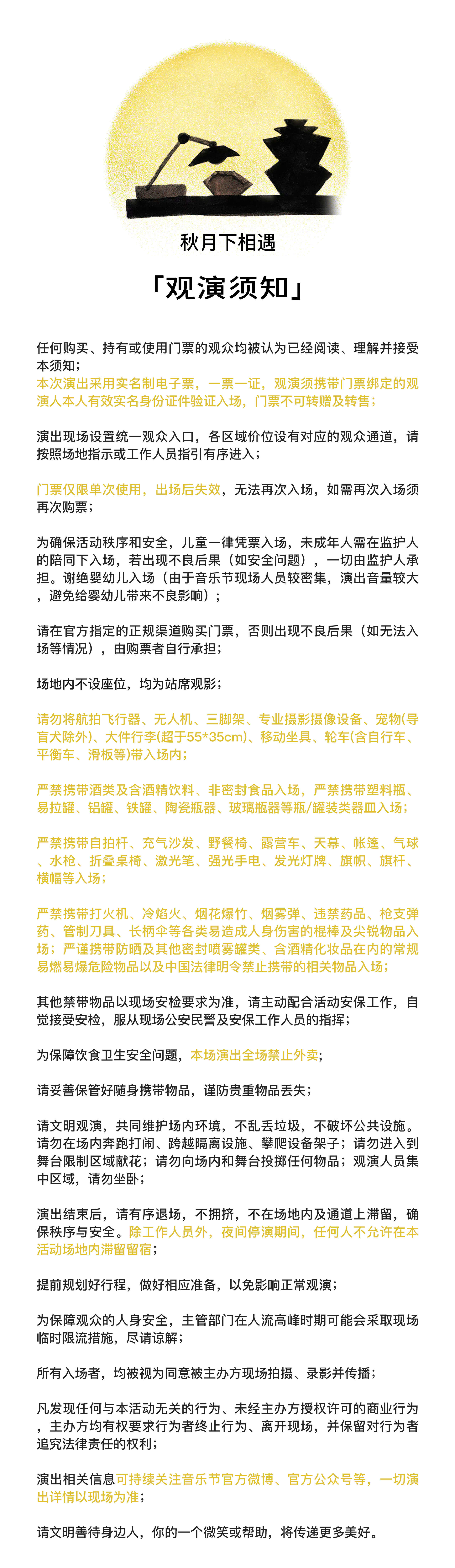 1.演出票品为特殊商品,除不可抗力因素导致演出取消外,订单不支持退换,可在平台转售; 2.演出详情仅供参考,具体以主办方公布信息及现场为准,请准时到场以免错过演出; 3.有票官方确保售出票品真实有效,请放心购买; 4.根据演出火爆情况,有票平台可能会将您所选的快递送票、上门自取等取票方式调整为现场取票,敬请谅解; 5.平台会尽力促使卖家履行交易协议,如果卖家付票过程中发生问题,本平台可协调相同或更高票挡的票品代替,否则平台将全额退款并按订单上约定的赔付方式与金额向用户进行赔付; 6.为了安全起见需要本人签收,演出快递票均为快递费到付(不包邮),请知晓!