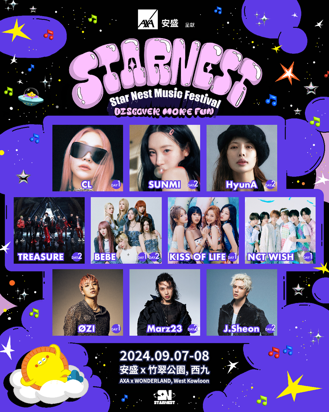 Star Nest Music Festival首次登入亚洲选择在9月7日、8日于安盛 x 竹翠公园,西九举行,集结超强韩流偶像、话题华语歌手和能量四射的DJ新星,在这个全新的Star Nest世界,你将见证首次南韩二代团中气势如虹的2NE1灵魂人物兼队长CL、来到香港号称南韩腿精的二代女团代表SUNMI(宣美)、性感女神HyunA(泫雅)的炫目表演。宝藏男孩TREASURE、NCT WISH将用惊人魅力席卷全场粉丝的目光,还有用精准的眼光发掘未来性大势新团同时也是首次抵达香港的KISS OF LIFE和BEBE,此外亚洲嘻哈天王ØZI、为华语歌坛注入新能量的J.Sheon和愈来愈强大的Marz23,他们将用最震撼的节奏和动感的旋律点燃你的心跳节奏与热情。