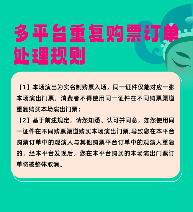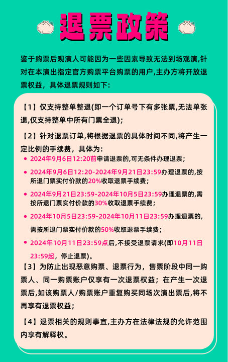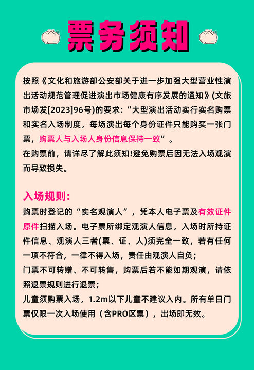 1.演出票品为特殊商品,除不可抗力因素导致演出取消外,订单不支持退换,可在平台转售; 2.演出详情仅供参考,具体以主办方公布信息及现场为准,请准时到场以免错过演出; 3.有票官方确保售出票品真实有效,请放心购买; 4.根据演出火爆情况,有票平台可能会将您所选的快递送票、上门自取等取票方式调整为现场取票,敬请谅解; 5.平台会尽力促使卖家履行交易协议,如果卖家付票过程中发生问题,本平台可协调相同或更高票挡的票品代替,否则平台将全额退款并按订单上约定的赔付方式与金额向用户进行赔付; 6.为了安全起见需要本人签收,演出快递票均为快递费到付(不包邮),请知晓!