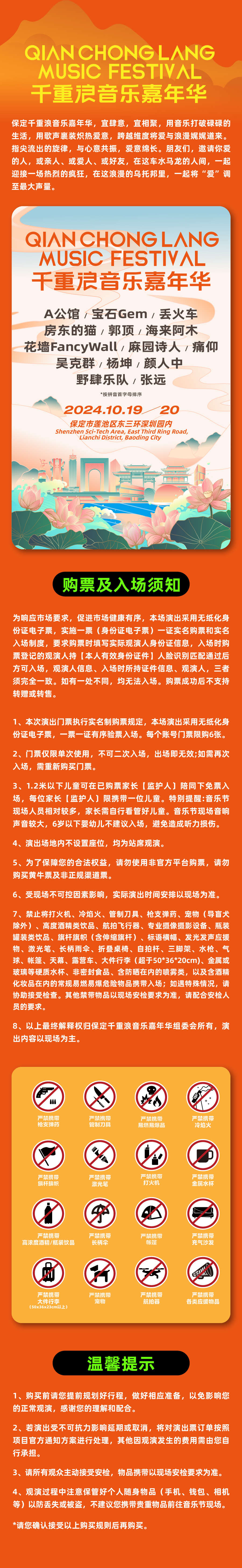 1.演出票品为特殊商品,除不可抗力因素导致演出取消外,订单不支持退换,可在平台转售; 2.演出详情仅供参考,具体以主办方公布信息及现场为准,请准时到场以免错过演出; 3.有票官方确保售出票品真实有效,请放心购买; 4.根据演出火爆情况,有票平台可能会将您所选的快递送票、上门自取等取票方式调整为现场取票,敬请谅解; 5.平台会尽力促使卖家履行交易协议,如果卖家付票过程中发生问题,本平台可协调相同或更高票挡的票品代替,否则平台将全额退款并按订单上约定的赔付方式与金额向用户进行赔付; 6.为了安全起见需要本人签收,演出快递票均为快递费到付(不包邮),请知晓!