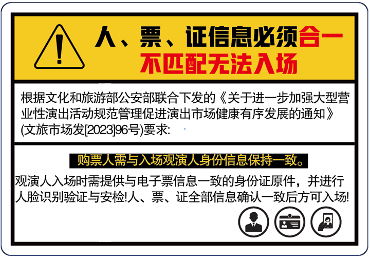 1.演出票品为特殊商品,除不可抗力因素导致演出取消外,订单不支持退换,可在平台转售; 2.演出详情仅供参考,具体以主办方公布信息及现场为准,请准时到场以免错过演出; 3.有票官方确保售出票品真实有效,请放心购买; 4.根据演出火爆情况,有票平台可能会将您所选的快递送票、上门自取等取票方式调整为现场取票,敬请谅解; 5.平台会尽力促使卖家履行交易协议,如果卖家付票过程中发生问题,本平台可协调相同或更高票挡的票品代替,否则平台将全额退款并按订单上约定的赔付方式与金额向用户进行赔付; 6.为了安全起见需要本人签收,演出快递票均为快递费到付(不包邮),请知晓!