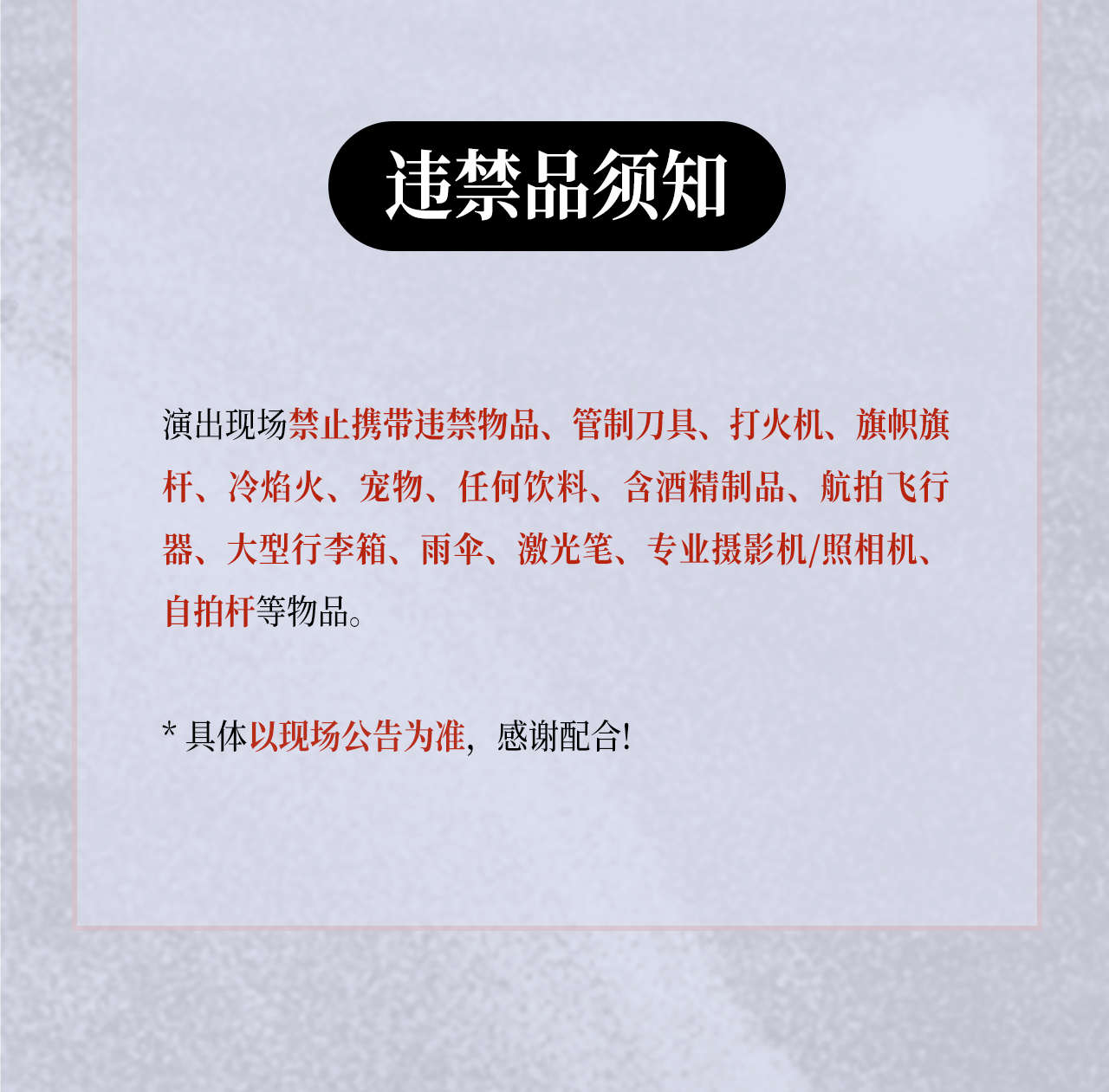 1.演出票品为特殊商品,除不可抗力因素导致演出取消外,订单不支持退换,可在平台转售; 2.演出详情仅供参考,具体以主办方公布信息及现场为准,请准时到场以免错过演出; 3.有票官方确保售出票品真实有效,请放心购买; 4.根据演出火爆情况,有票平台可能会将您所选的快递送票、上门自取等取票方式调整为现场取票,敬请谅解; 5.平台会尽力促使卖家履行交易协议,如果卖家付票过程中发生问题,本平台可协调相同或更高票挡的票品代替,否则平台将全额退款并按订单上约定的赔付方式与金额向用户进行赔付; 6.为了安全起见需要本人签收,演出快递票均为快递费到付(不包邮),请知晓!