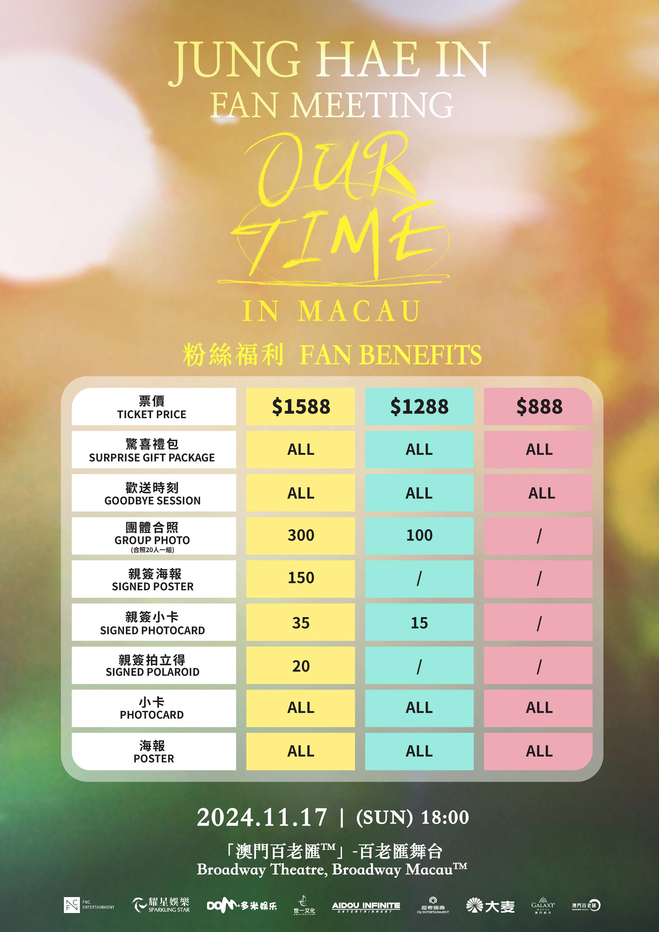 No matter when or where, JUNG HAE IN will always bring healing to everyone with his warm smile. Now he is coming to Macau to share his love with all of you!Dear HAEINESS, let's create unforgettable memories with HAE IN Oppa at “OUR TIME” !❤️
