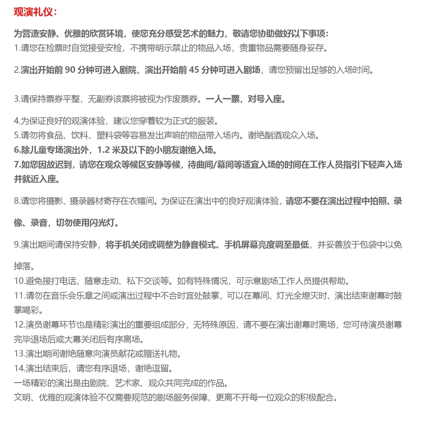 1.演出票品为特殊商品,除不可抗力因素导致演出取消外,订单不支持退换,可在平台转售; 2.演出详情仅供参考,具体以主办方公布信息及现场为准,请准时到场以免错过演出; 3.有票官方确保售出票品真实有效,请放心购买; 4.根据演出火爆情况,有票平台可能会将您所选的快递送票、上门自取等取票方式调整为现场取票,敬请谅解; 5.平台会尽力促使卖家履行交易协议,如果卖家付票过程中发生问题,本平台可协调相同或更高票挡的票品代替,否则平台将全额退款并按订单上约定的赔付方式与金额向用户进行赔付; 6.为了安全起见需要本人签收,演出快递票均为快递费到付(不包邮),请知晓!