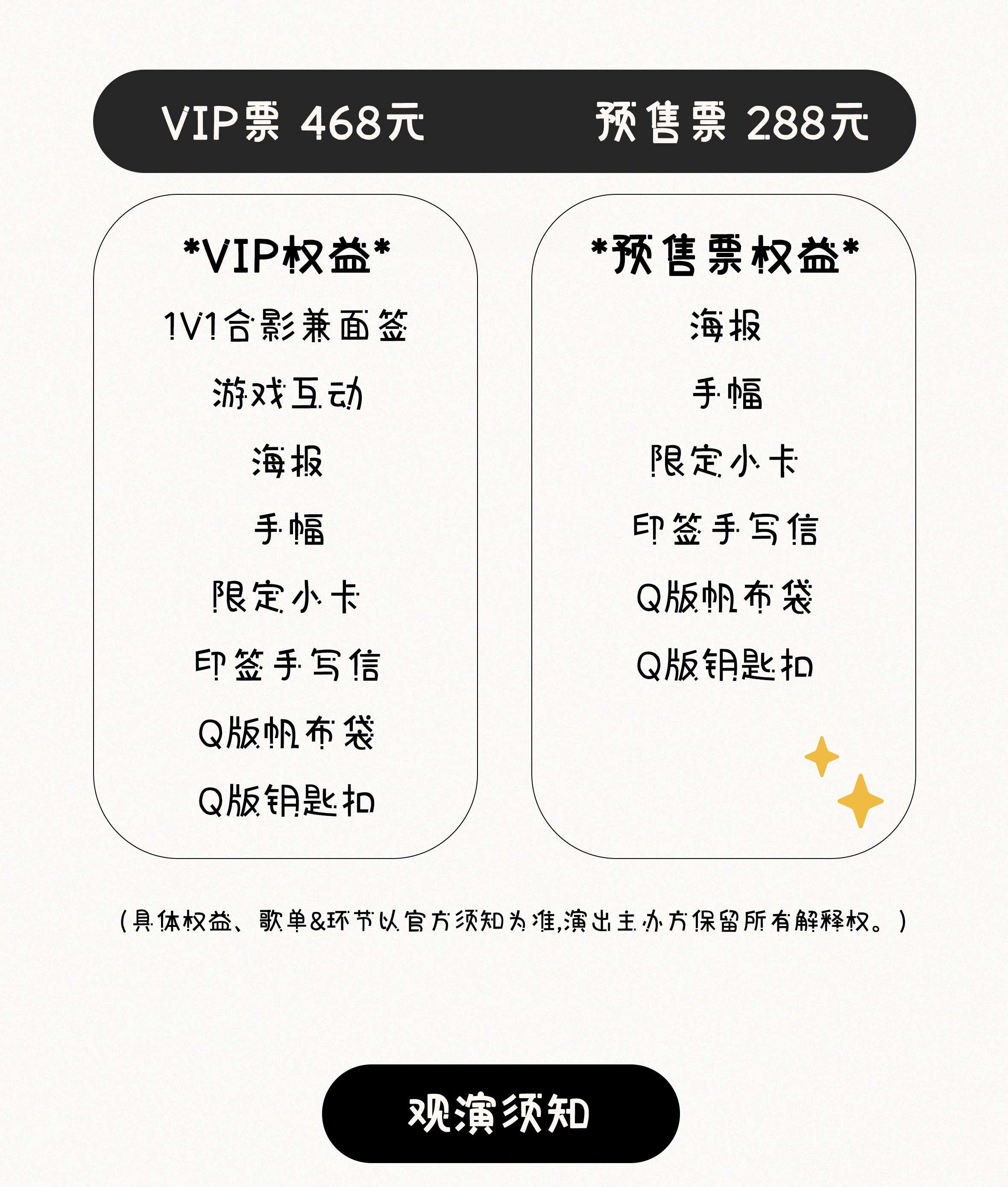 1.演出票品为特殊商品,除不可抗力因素导致演出取消外,订单不支持退换,可在平台转售; 2.演出详情仅供参考,具体以主办方公布信息及现场为准,请准时到场以免错过演出; 3.有票官方确保售出票品真实有效,请放心购买; 4.根据演出火爆情况,有票平台可能会将您所选的快递送票、上门自取等取票方式调整为现场取票,敬请谅解; 5.平台会尽力促使卖家履行交易协议,如果卖家付票过程中发生问题,本平台可协调相同或更高票挡的票品代替,否则平台将全额退款并按订单上约定的赔付方式与金额向用户进行赔付; 6.为了安全起见需要本人签收,演出快递票均为快递费到付(不包邮),请知晓!