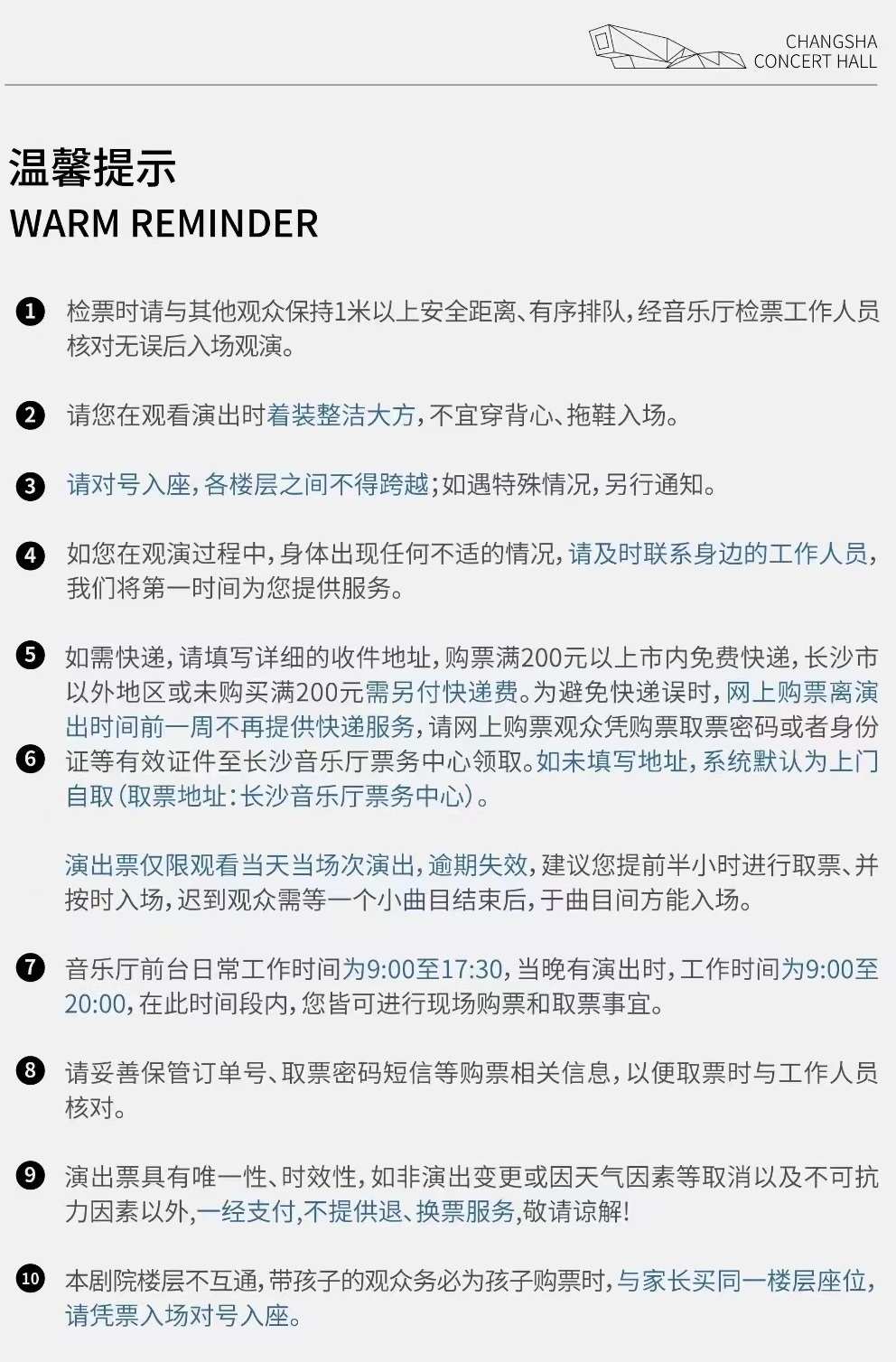 1.演出票品为特殊商品,除不可抗力因素导致演出取消外,订单不支持退换,可在平台转售; 2.演出详情仅供参考,具体以主办方公布信息及现场为准,请准时到场以免错过演出; 3.有票官方确保售出票品真实有效,请放心购买; 4.根据演出火爆情况,有票平台可能会将您所选的快递送票、上门自取等取票方式调整为现场取票,敬请谅解; 5.平台会尽力促使卖家履行交易协议,如果卖家付票过程中发生问题,本平台可协调相同或更高票挡的票品代替,否则平台将全额退款并按订单上约定的赔付方式与金额向用户进行赔付; 6.为了安全起见需要本人签收,演出快递票均为快递费到付(不包邮),请知晓!