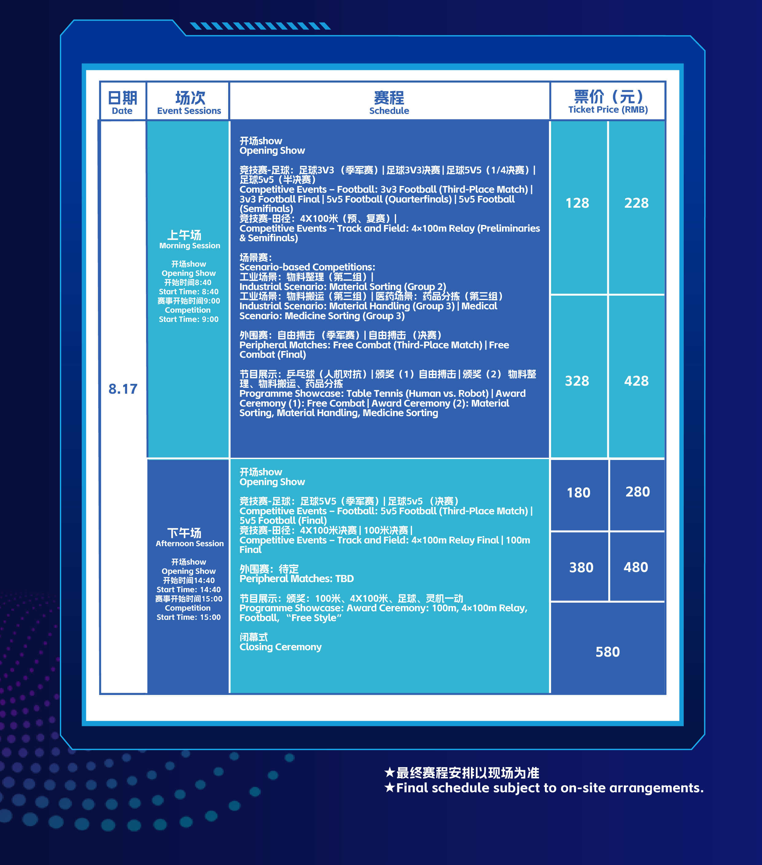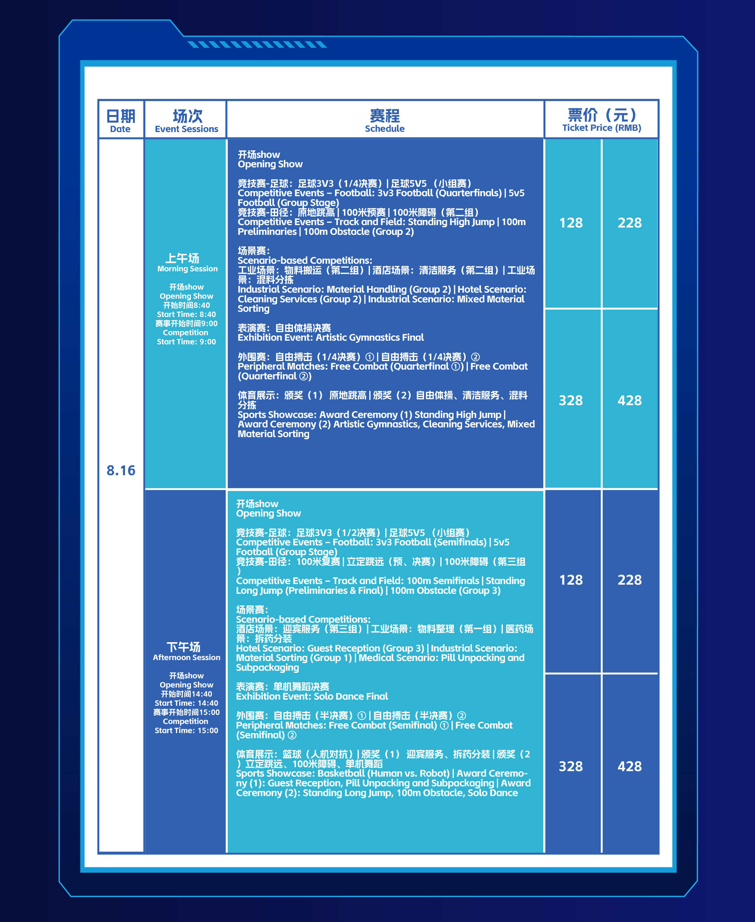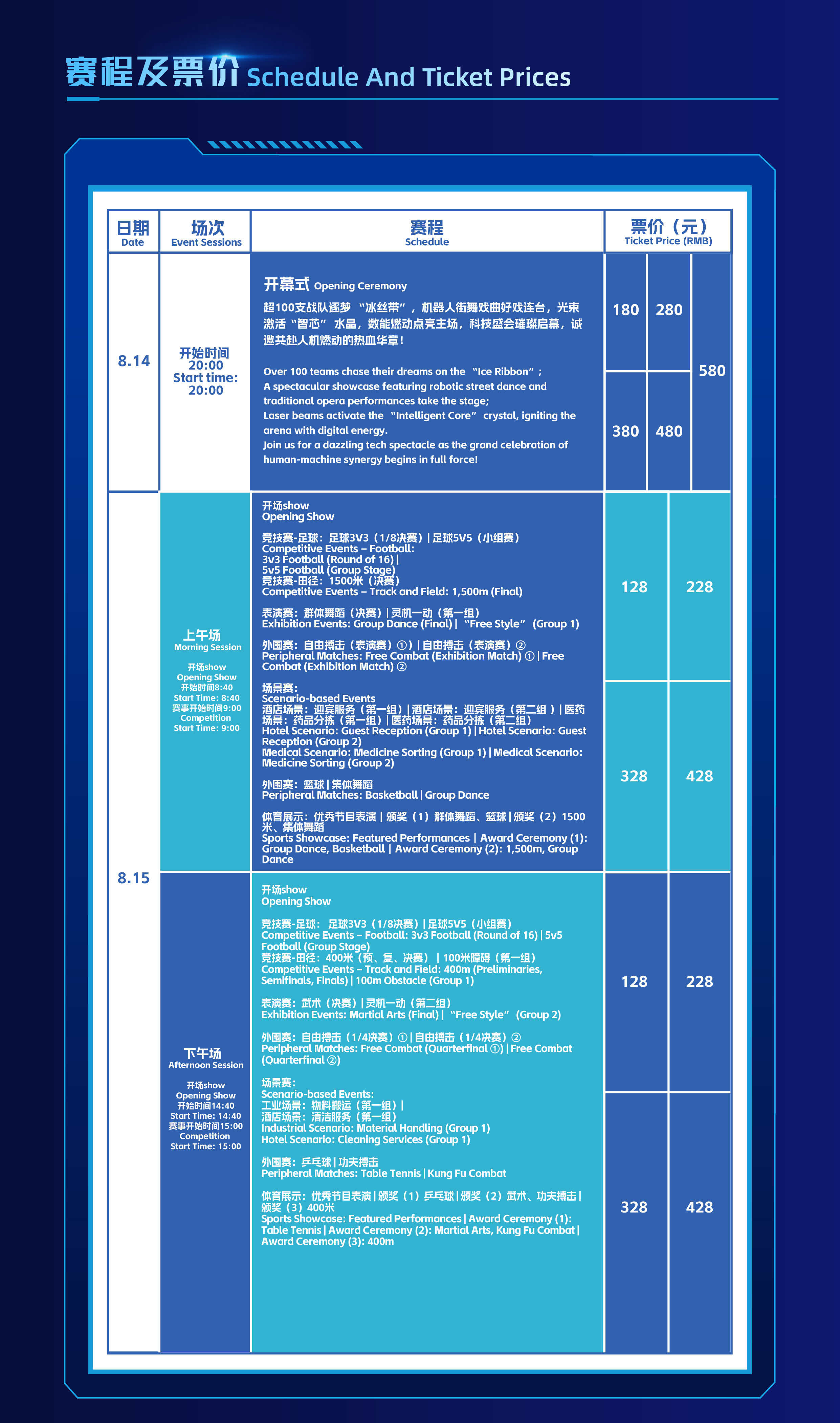 As part of the“Contests, Performances, and an Amazing Beijing”program, World Humanoid Robot Games ticket holders can purchase tickets to the Bird’s Nest and the Water Cube at a 20% discount from July 27 to August 17.