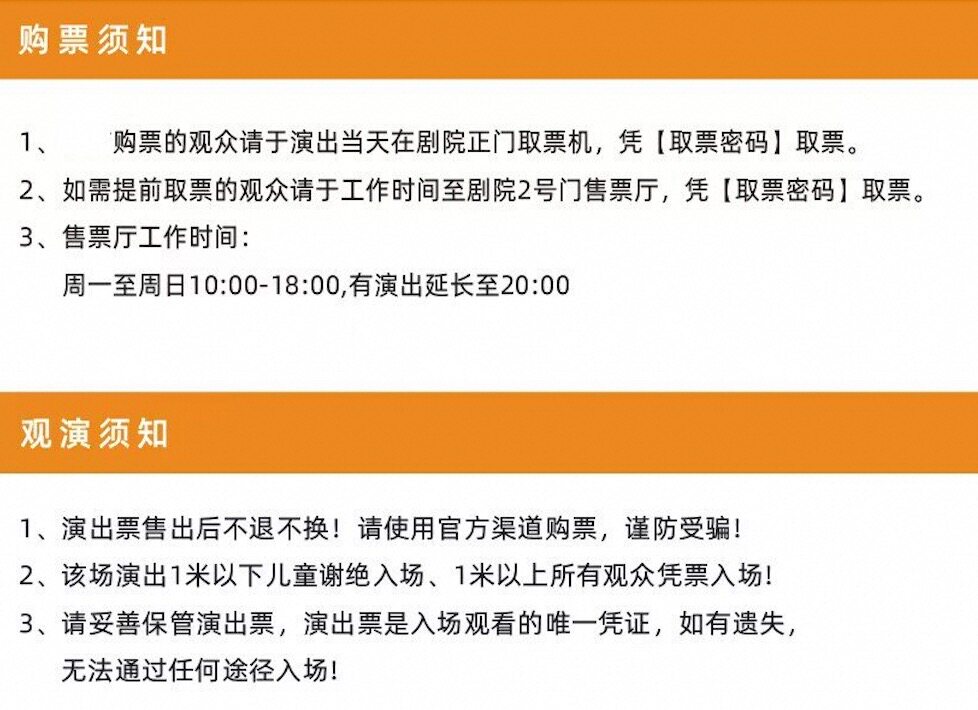 1.演出票品为特殊商品,除不可抗力因素导致演出取消外,订单不支持退换,可在平台转售; 2.演出详情仅供参考,具体以主办方公布信息及现场为准,请准时到场以免错过演出; 3.有票官方确保售出票品真实有效,请放心购买; 4.根据演出火爆情况,有票平台可能会将您所选的快递送票、上门自取等取票方式调整为现场取票,敬请谅解; 5.平台会尽力促使卖家履行交易协议,如果卖家付票过程中发生问题,本平台可协调相同或更高票挡的票品代替,否则平台将全额退款并按订单上约定的赔付方式与金额向用户进行赔付; 6.为了安全起见需要本人签收,演出快递票均为快递费到付(不包邮),请知晓!