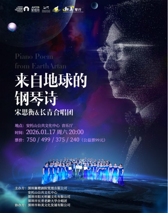 《来自地球的钢琴诗》是一场跨越代际与时空的艺术对话,由国际钢琴大师宋思衡与深圳长青老龄大学合唱团联袂呈现。 音乐会上半场,宋思衡将完整演绎他的同名原创钢琴套曲《来自地球的钢琴诗》十二首。这并非传统的古典乐章,而是十二篇用音符写就的“音乐日记”。作品穿梭于古典、印象派与现代极简主义之间,以钢琴为笔,描绘了从地球诞生初的静谧到人类文明的情感万象。每一首诗都是一个独立的世界,共同编织出一幅关于生命、记忆与未来的壮丽声景,引领观众聆听地球的呼吸与心跳。 下半场,深圳长青老龄大学合唱团将以饱经岁月洗礼的醇厚之声,唱响从古典诗词到时代金章的八首作品。从《大江东去》的豪迈到《沁园春·雪》的壮阔,从《军港之夜》的温情到《保卫黄河》的激越,他们的演唱不仅是艺术的呈现,更是生命阅历的抒发。最终,上下半场的艺术精神在“家国情怀”与“生命赞歌”的主题中交汇融合,成就一场深邃而温暖、个人叙事与集体记忆共鸣的非凡演出。