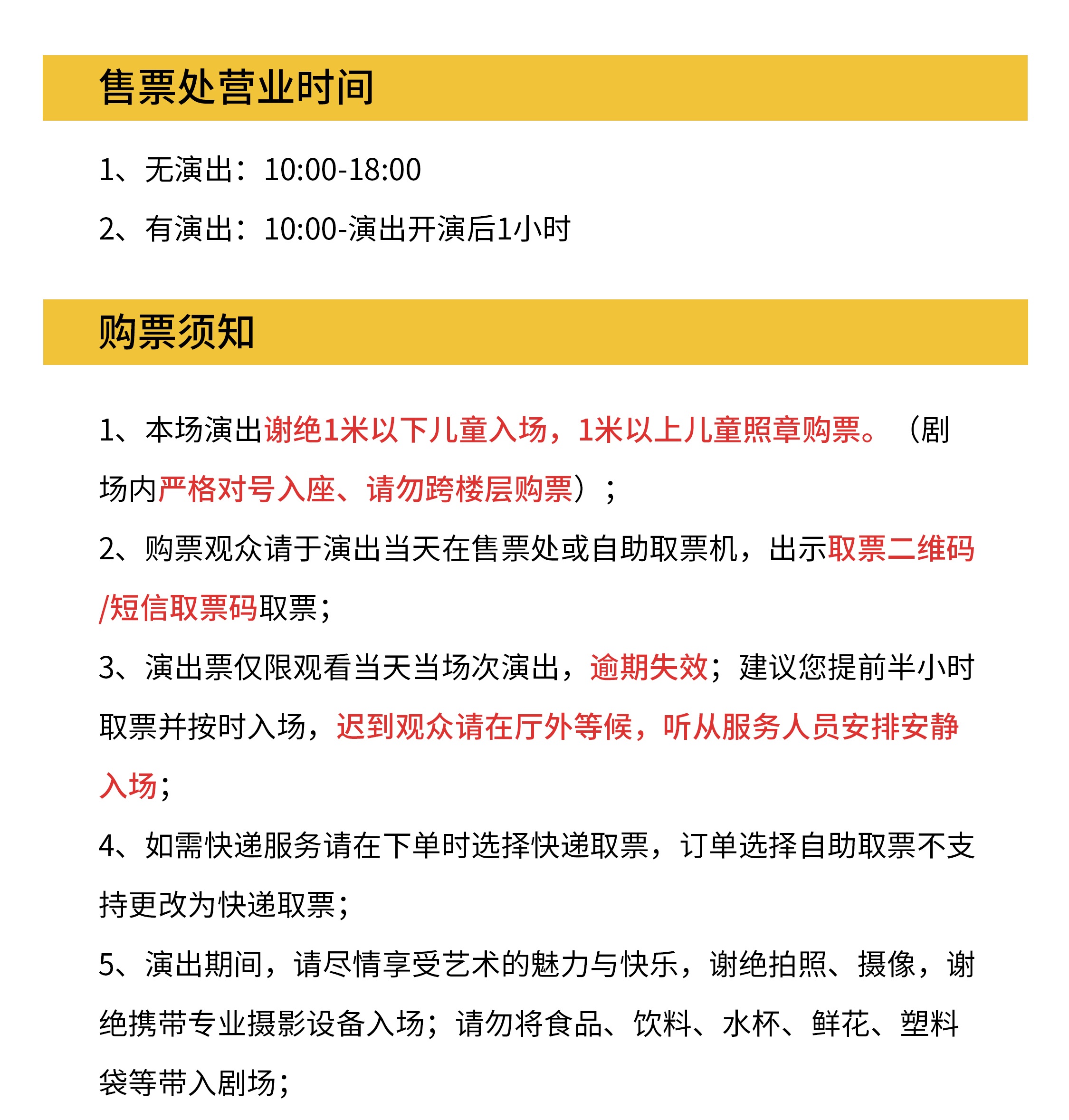 1.演出票品为特殊商品,除不可抗力因素导致演出取消外,订单不支持退换,可在平台转售; 2.演出详情仅供参考,具体以主办方公布信息及现场为准,请准时到场以免错过演出; 3.有票官方确保售出票品真实有效,请放心购买; 4.根据演出火爆情况,有票平台可能会将您所选的快递送票、上门自取等取票方式调整为现场取票,敬请谅解; 5.平台会尽力促使卖家履行交易协议,如果卖家付票过程中发生问题,本平台可协调相同或更高票挡的票品代替,否则平台将全额退款并按订单上约定的赔付方式与金额向用户进行赔付; 6.为了安全起见需要本人签收,演出快递票均为快递费到付(不包邮),请知晓!