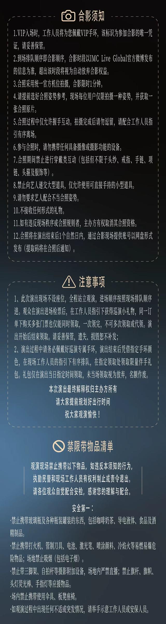 1.演出票品为特殊商品,除不可抗力因素导致演出取消外,订单不支持退换,可在平台转售; 2.演出详情仅供参考,具体以主办方公布信息及现场为准,请准时到场以免错过演出; 3.有票官方确保售出票品真实有效,请放心购买; 4.根据演出火爆情况,有票平台可能会将您所选的快递送票、上门自取等取票方式调整为现场取票,敬请谅解; 5.平台会尽力促使卖家履行交易协议,如果卖家付票过程中发生问题,本平台可协调相同或更高票挡的票品代替,否则平台将全额退款并按订单上约定的赔付方式与金额向用户进行赔付; 6.为了安全起见需要本人签收,演出快递票均为快递费到付(不包邮),请知晓!