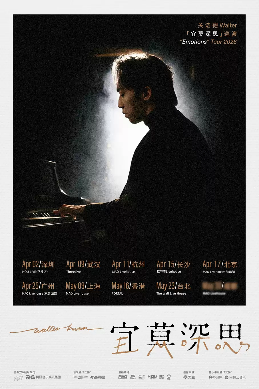 宜莫深思即是不必深究 Emotions (情绪)的来处,只需诚实感受此刻的悸动,「宜莫深思Emotions」巡演的现场会将呈现 Walter 在各个时期的治愈旋律,以此化作情绪的容器,用不同风格的曲目一同串联起你与关浩德Walter音乐相伴的时光碎片。在「宜莫深思Emotions」巡演的 Live 现场,不会有喧嚣的打扰,只有旋律与心声的共鸣。Walter将用温柔声线,带领你穿越情绪的迷雾森林,释放焦灼与愤懑,拥抱喜悦与平静。每一段旋律都是一次解压,每一句歌词都是一次接纳——这是属于水哥与“水军”们(歌迷称谓)的情绪乌托邦,也是一场双向奔赴的温暖相聚。