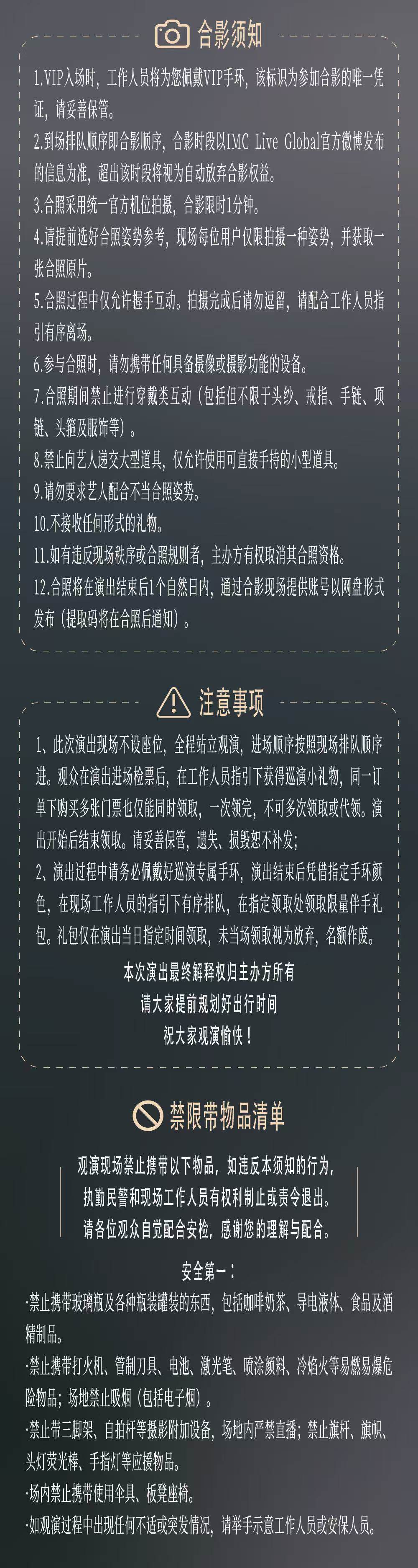 1.演出票品为特殊商品,除不可抗力因素导致演出取消外,订单不支持退换,可在平台转售; 2.演出详情仅供参考,具体以主办方公布信息及现场为准,请准时到场以免错过演出; 3.有票官方确保售出票品真实有效,请放心购买; 4.根据演出火爆情况,有票平台可能会将您所选的快递送票、上门自取等取票方式调整为现场取票,敬请谅解; 5.平台会尽力促使卖家履行交易协议,如果卖家付票过程中发生问题,本平台可协调相同或更高票挡的票品代替,否则平台将全额退款并按订单上约定的赔付方式与金额向用户进行赔付; 6.为了安全起见需要本人签收,演出快递票均为快递费到付(不包邮),请知晓!