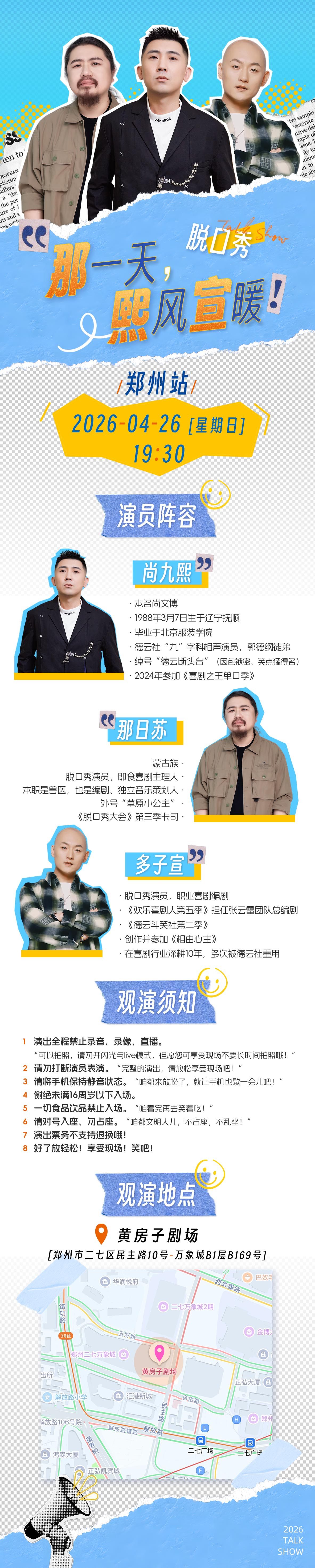 首页 > 曲艺杂谈 > 尚九熙·多子宣·那日苏|《那一天,熙风宣暖》脱口秀巡演-郑州站
