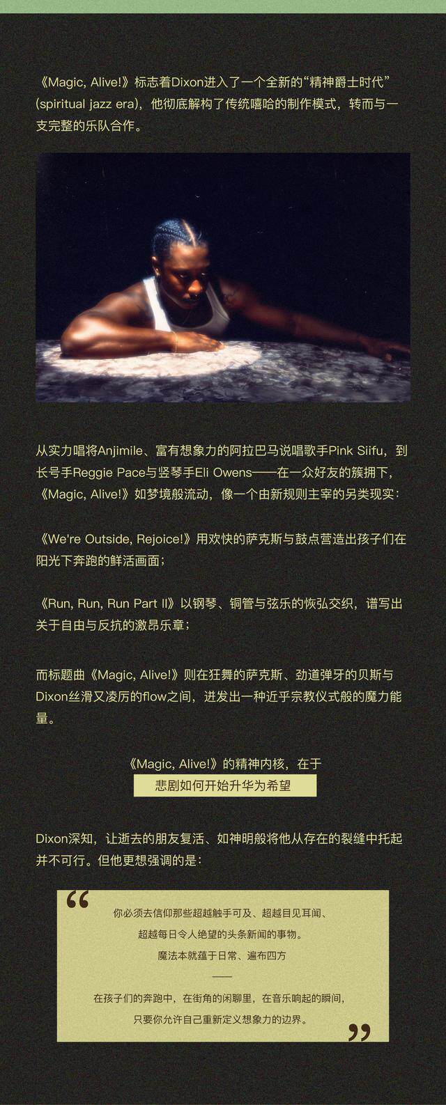 这张35分钟、包含11首曲目的概念专辑,讲述了一个既私密又普世的故事:三个孩子失去挚友后,试图以“魔法”唤回逝者的灵魂。Dixon用他层次丰沛的爵士韵律,将哀悼、友谊与奇迹编织成一场音乐仪式。从Toni Morrison的文学指涉到街头日常的鲜活记录,他的音乐从来不止于flow的炫技——更是对喜悦、痛苦与坚韧的深刻速写。