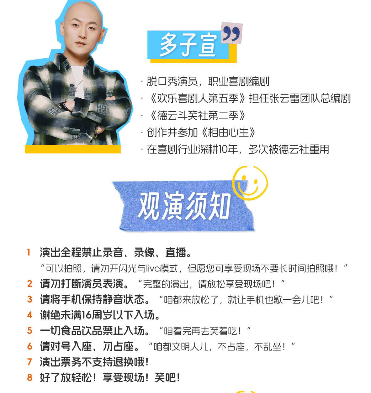 1.演出票品为特殊商品,除不可抗力因素导致演出取消外,订单不支持退换,可在平台转售; 2.演出详情仅供参考,具体以主办方公布信息及现场为准,请准时到场以免错过演出; 3.有票官方确保售出票品真实有效,请放心购买; 4.根据演出火爆情况,有票平台可能会将您所选的快递送票、上门自取等取票方式调整为现场取票,敬请谅解; 5.平台会尽力促使卖家履行交易协议,如果卖家付票过程中发生问题,本平台可协调相同或更高票挡的票品代替,否则平台将全额退款并按订单上约定的赔付方式与金额向用户进行赔付; 6.为了安全起见需要本人签收,演出快递票均为快递费到付(不包邮),请知晓!