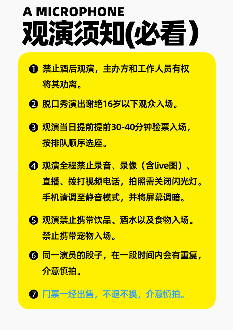 1.演出票品为特殊商品,除不可抗力因素导致演出取消外,订单不支持退换,可在平台转售; 2.演出详情仅供参考,具体以主办方公布信息及现场为准,请准时到场以免错过演出; 3.有票官方确保售出票品真实有效,请放心购买; 4.根据演出火爆情况,有票平台可能会将您所选的快递送票、上门自取等取票方式调整为现场取票,敬请谅解; 5.平台会尽力促使卖家履行交易协议,如果卖家付票过程中发生问题,本平台可协调相同或更高票挡的票品代替,否则平台将全额退款并按订单上约定的赔付方式与金额向用户进行赔付; 6.为了安全起见需要本人签收,演出快递票均为快递费到付(不包邮),请知晓!
