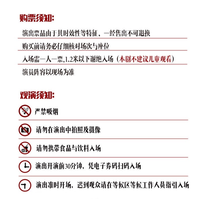 1.演出票品为特殊商品,除不可抗力因素导致演出取消外,订单不支持退换,可在平台转售; 2.演出详情仅供参考,具体以主办方公布信息及现场为准,请准时到场以免错过演出; 3.有票官方确保售出票品真实有效,请放心购买; 4.根据演出火爆情况,有票平台可能会将您所选的快递送票、上门自取等取票方式调整为现场取票,敬请谅解; 5.平台会尽力促使卖家履行交易协议,如果卖家付票过程中发生问题,本平台可协调相同或更高票挡的票品代替,否则平台将全额退款并按订单上约定的赔付方式与金额向用户进行赔付; 6.为了安全起见需要本人签收,演出快递票均为快递费到付(不包邮),请知晓!
