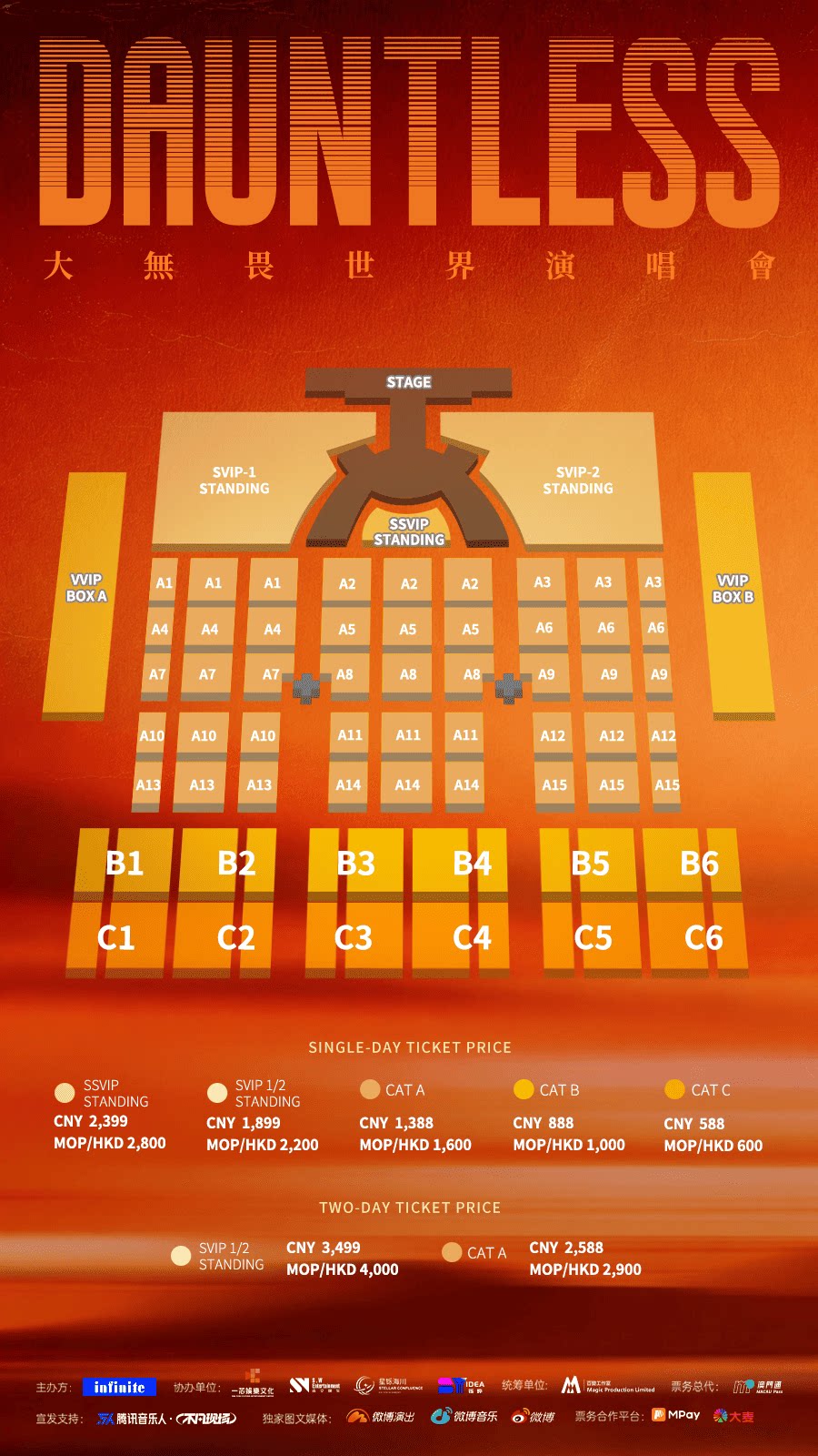 澳门币票价MOP:2800(SSVIP STANDING)/2200(SVIP STANDING)/1600(CAT A)/1000(CAT B)/600(CAT C)