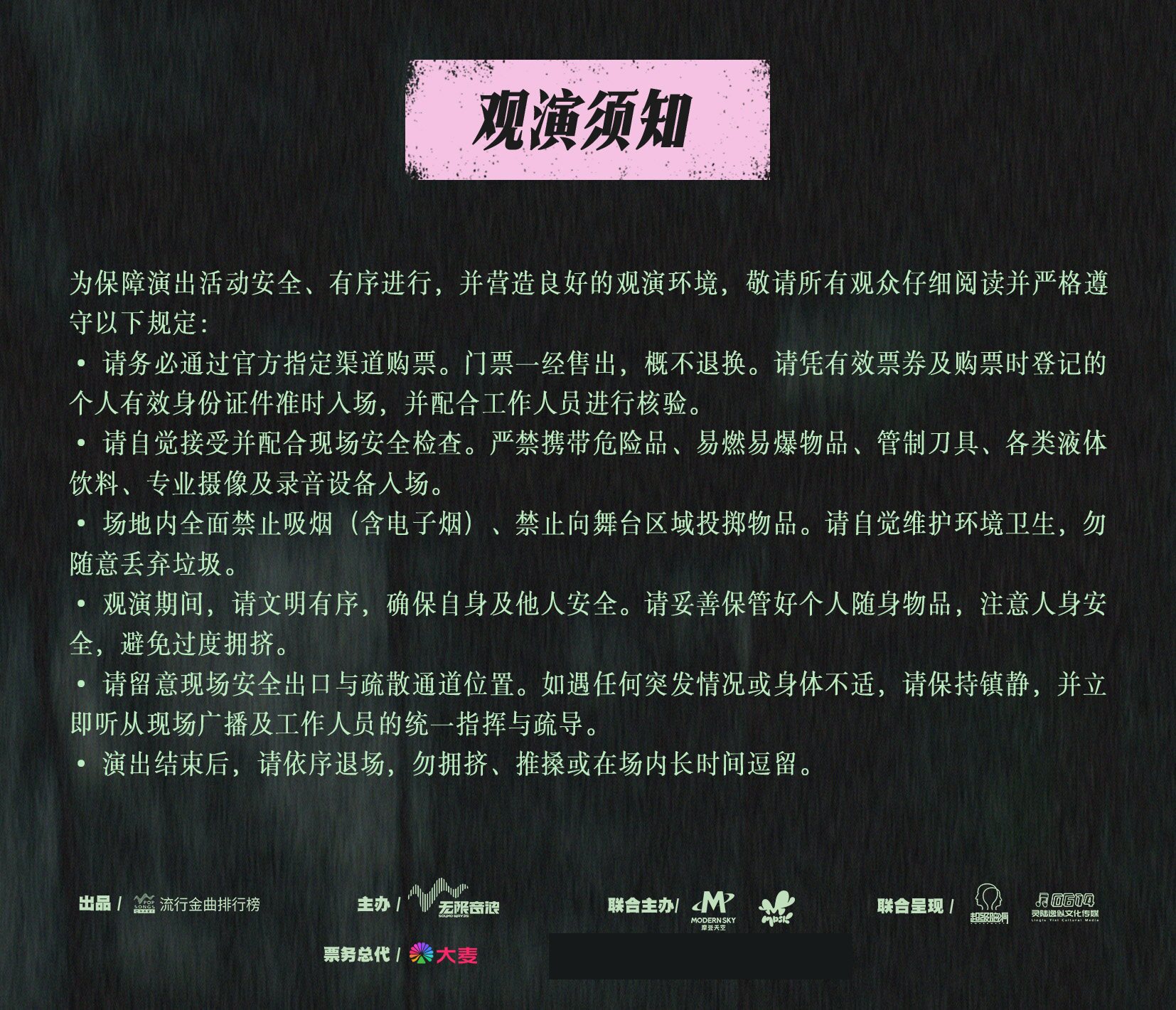 1.演出票品为特殊商品,除不可抗力因素导致演出取消外,订单不支持退换,可在平台转售; 2.演出详情仅供参考,具体以主办方公布信息及现场为准,请准时到场以免错过演出; 3.有票官方确保售出票品真实有效,请放心购买; 4.根据演出火爆情况,有票平台可能会将您所选的快递送票、上门自取等取票方式调整为现场取票,敬请谅解; 5.平台会尽力促使卖家履行交易协议,如果卖家付票过程中发生问题,本平台可协调相同或更高票挡的票品代替,否则平台将全额退款并按订单上约定的赔付方式与金额向用户进行赔付; 6.为了安全起见需要本人签收,演出快递票均为快递费到付(不包邮),请知晓!
