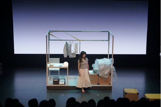 主角秀茵身处首尔半地下室,通过沙盘模型构建考试院压抑的空间;以实时投影映射她对人生片段的回望,舞台结构打破传统叙述,强化身体行动与精神层级的交织。