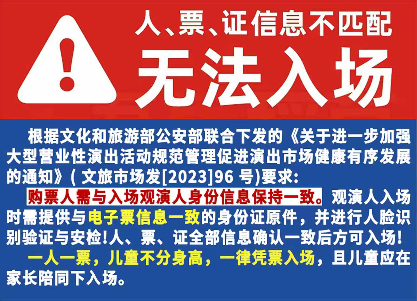 1.演出票品为特殊商品,除不可抗力因素导致演出取消外,订单不支持退换,可在平台转售; 2.演出详情仅供参考,具体以主办方公布信息及现场为准,请准时到场以免错过演出; 3.有票官方确保售出票品真实有效,请放心购买; 4.根据演出火爆情况,有票平台可能会将您所选的快递送票、上门自取等取票方式调整为现场取票,敬请谅解; 5.平台会尽力促使卖家履行交易协议,如果卖家付票过程中发生问题,本平台可协调相同或更高票挡的票品代替,否则平台将全额退款并按订单上约定的赔付方式与金额向用户进行赔付; 6.为了安全起见需要本人签收,演出快递票均为快递费到付(不包邮),请知晓!