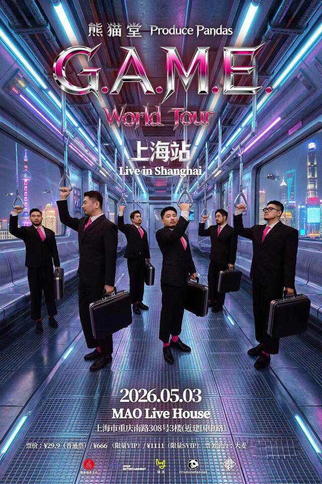 五一假期的快乐主场,由熊猫堂强势承包!2026 年 5 月 3 日,凭借全球 30 亿 + 播放量、登 Billboard 首页、获世界各地一线主流媒体报道的 Cpop 出海先锋男团 —— 熊猫堂 Produce Pandas,携「G.A.M.E.」巡演登陆上海 MAO Livehouse!这是他们时隔 5 年重返上海的全场全开麦专场公演,更是成团 5 年多沉淀后的实力兑现 —— 从 3 张正式专辑到 N 张主题 EP 与单曲,从近 70 首原创金曲到 20 余支风格 MV,每一份作品都是诚意答卷。而熊猫堂的舞台从不局限地域边界,每一场演出都是海内外各地粉丝奔赴的狂欢之约,这一次,在魔都集结,用「G.A.M.E.」开启假日音乐盛宴。