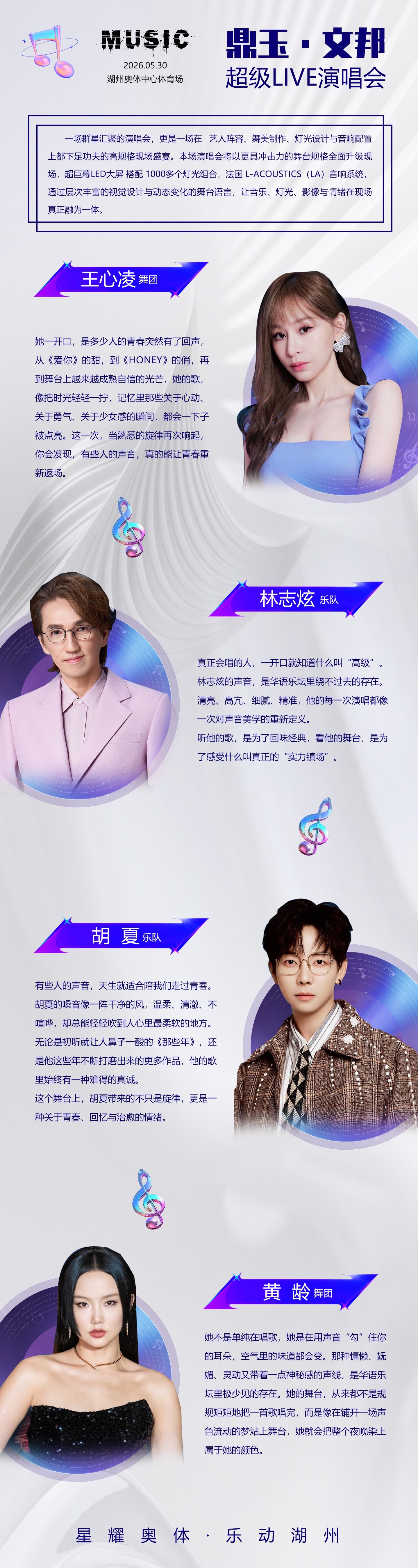 首页 > 演唱会 > 「王心凌/林志炫/胡夏/黄龄」鼎玉·文邦 超级LIVE演唱会