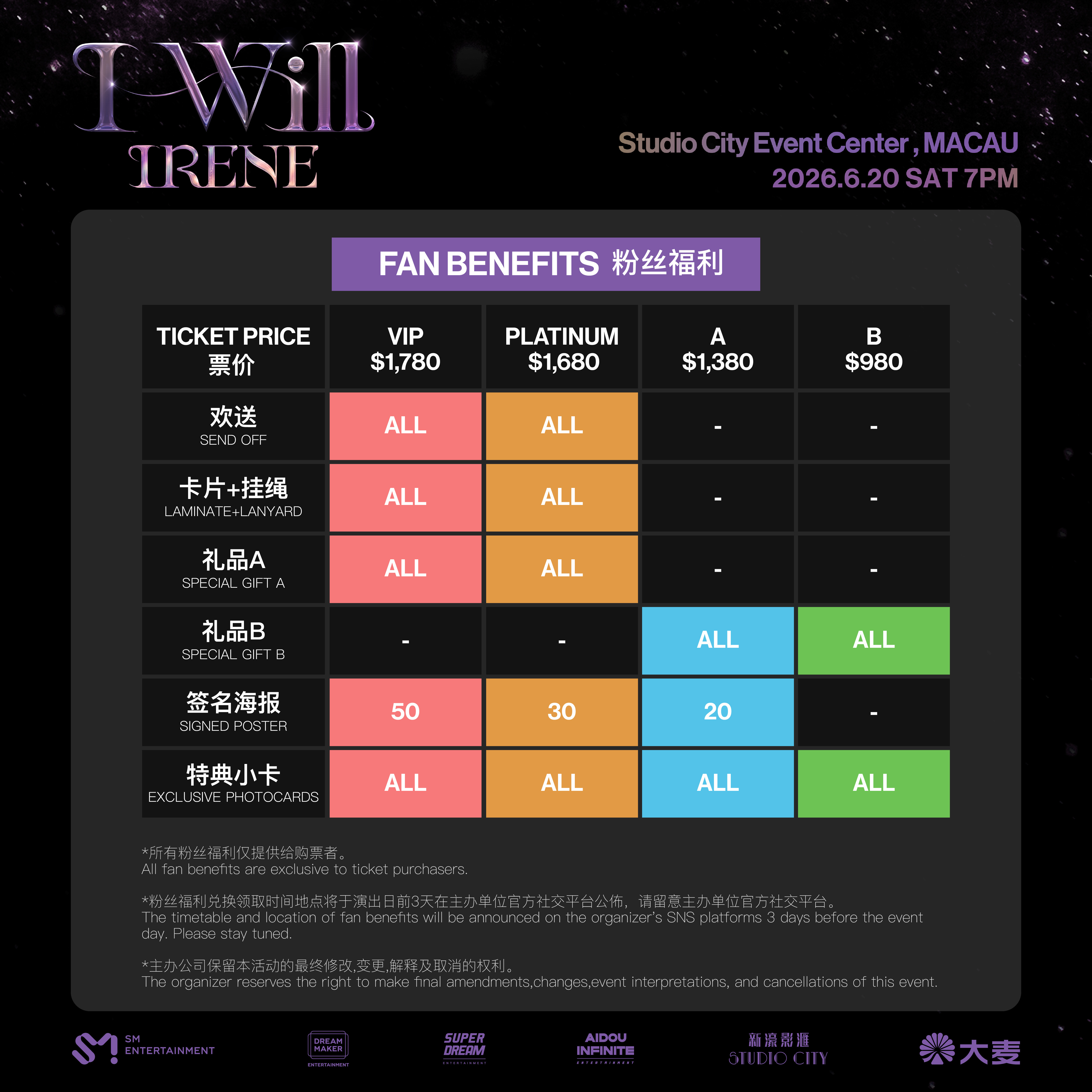Red Velvet成员IRENE即将带着她的首次个人亚洲巡回演唱会2026 IRENE ASIA TOUR [ I-WILL ]登陆中国澳门。在首尔站于5月23日和24日在奖忠体育馆拉开巡演序幕后,IRENE将于6月20日来到中国澳门,与当地及粤港澳大湾区的粉丝们见面。