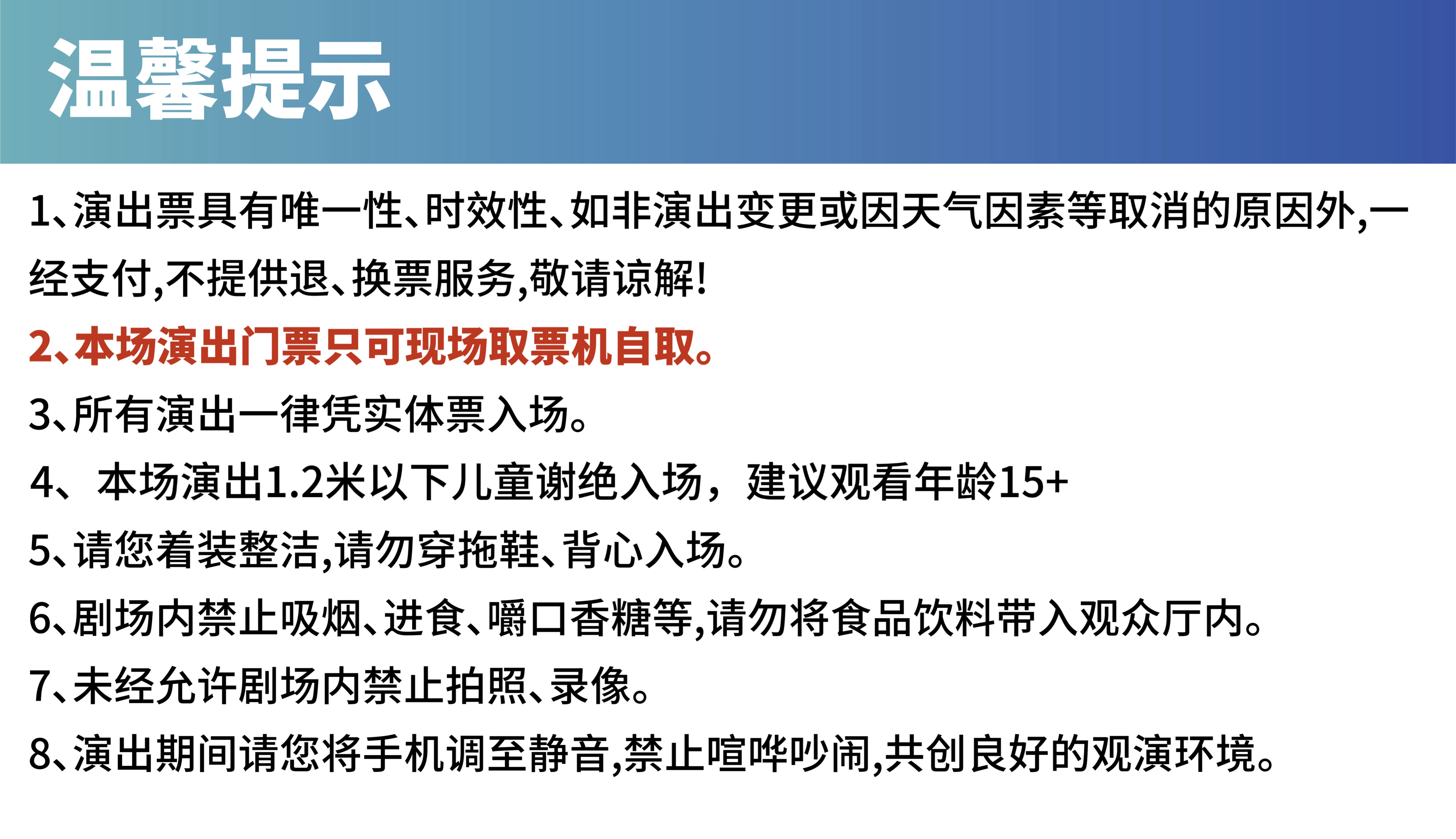 1.本场演出1.2米以下儿童谢绝入场,建议观看年龄15+