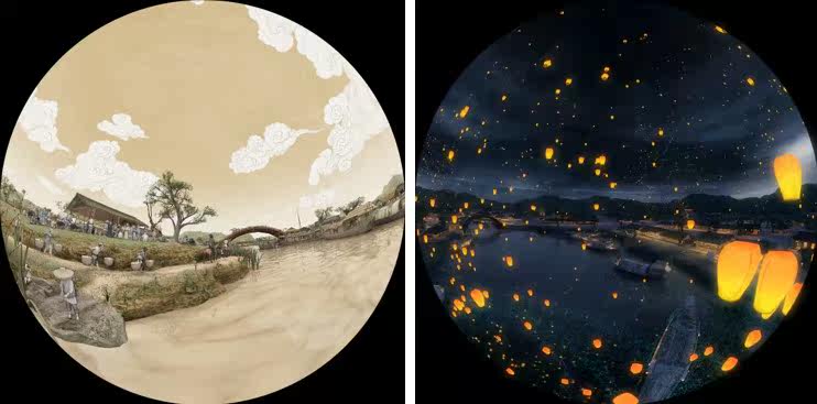 走过盛世长卷,便能听见水岸叮当声、街道酒肆的熙攘声--"汴河码头"球幕影院区域到了。走进球幕影院,就像置身于另一个时空,在球幕影院,我们能看到《清明上河图》通过数字艺术的形式,还原了画卷里的各个场景:清晨的汴河边,货船靠岸,码头工人扛着大包小包货物走向沿河街;街道两旁人声鼎沸,酒肆茶馆依次开张,店家在热情地招揽客人;虹桥下的大船上更是热闹非凡,人们在想办法让大船通过宛如飞虹的桥洞……影片的最后,夜幕降临,水波涟滟,孔明灯犹如星子飞入天空,观众也会被包裹进这梦境里,看汴河的十二时辰,赏尽"两岸风烟天下无"的盛景。