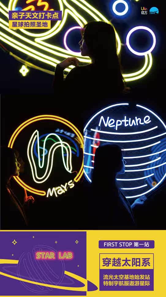 此次STAR LAB为半开放式展览体验,汇聚了天文科普、亲子互动、潮流打卡、以及多样的星球美食文化,共三个站点场馆。同时悠方(上海)双首层建筑特色,让你可以在太空和地球之间往返穿梭,一站式体验宇宙探索乐趣。