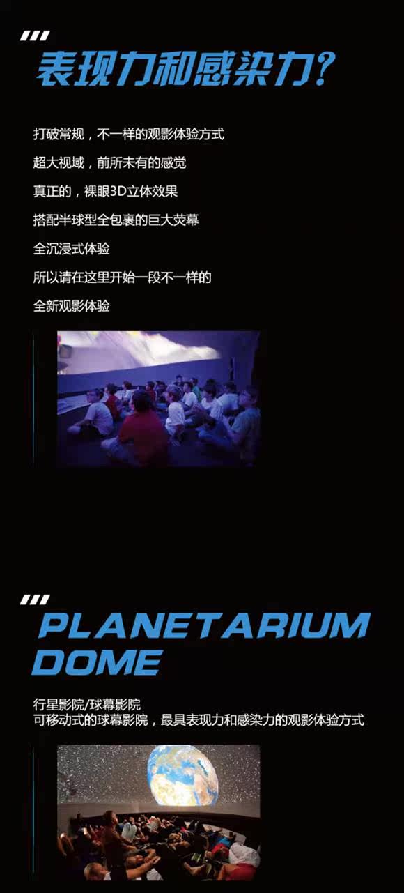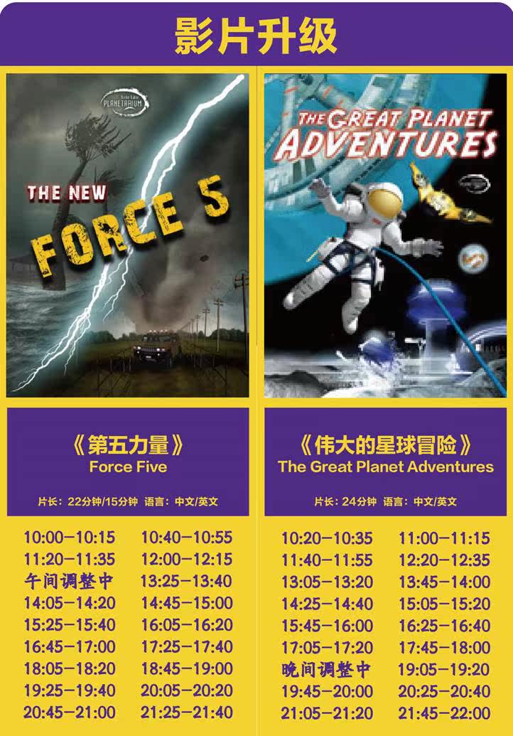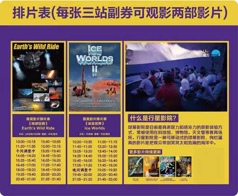 每日提供两部进口专利影片,星球触摸灯等互动体验(影片按不定时间进行更换,以现场信息为准)。