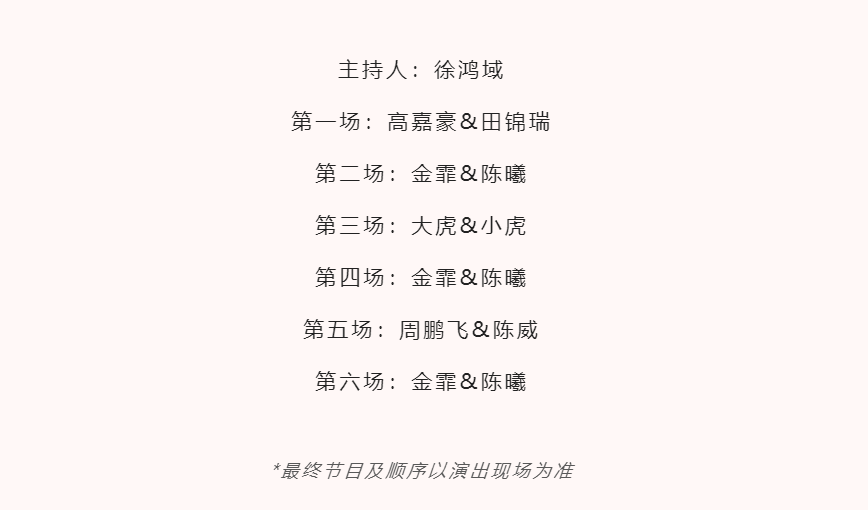 《周末喜相逢》《鲁豫有约》《跨界喜剧王》《相声有新人》等各大卫视节目及演出。