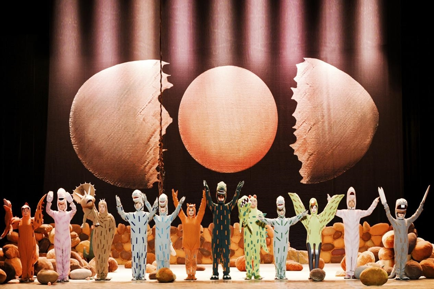 拉一下开关,月亮灭了;使劲跺一下脚,地上喷出气体来;红果子树倒着生长从天而降;太阳从蛋壳里孵出来;天上下起雨,掉下的雨滴却是蓝色的光斑……觉得不可思议么?而这恰恰正是《你看起来好像很好吃》的舞台上发生的事情。白垩纪险象环生、令人生畏的恐龙时代,如今在台上变成了一个可爱并且极富想象力的童话乐园。