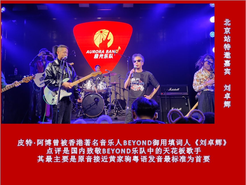 极光乐队是国内被香港音乐人BEYOND御用填词人《刘卓辉》老师认可致敬BEYOND的实力派乐队,2021极光乐队携手刘卓辉老师合作 刘卓辉作品粤语金曲巡回演唱会深圳站 沈阳站。极光乐队的演奏质量以及专业粤语演唱刘卓辉老师也给了肯定以及高度的评价。