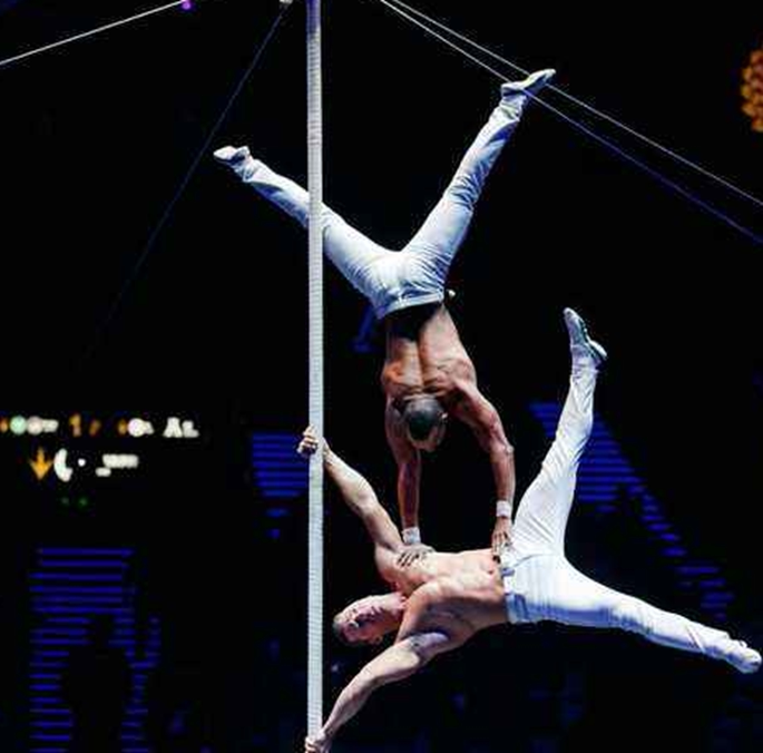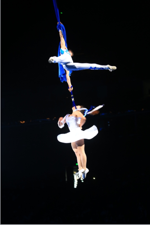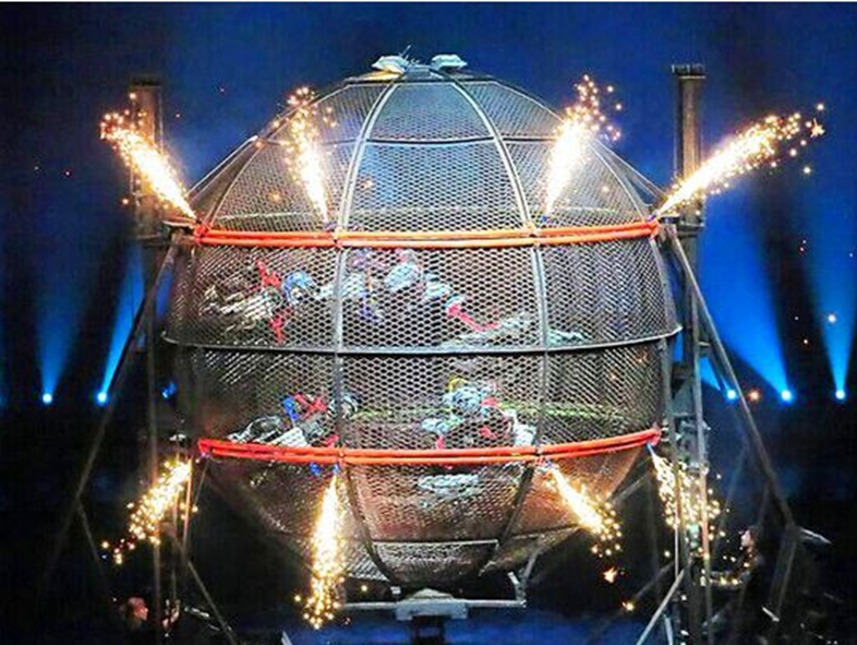 随着激动人心的音乐,演员在空中旋转的大轮中行走跳跃做出各种高难度动作。非常惊险哦!