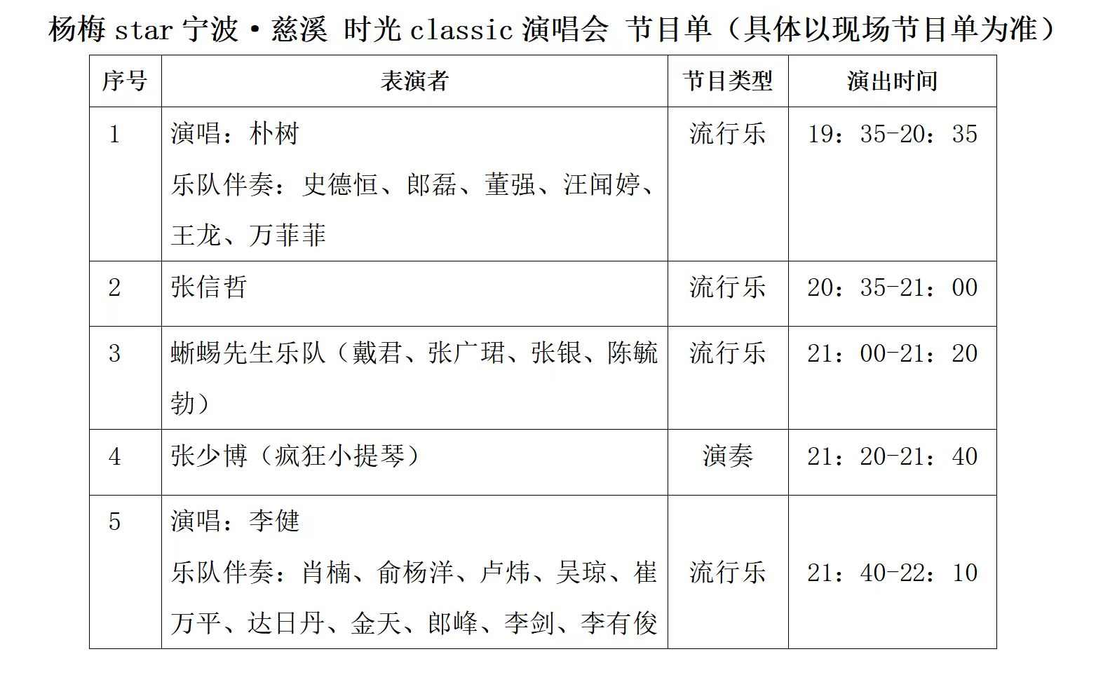 2023“杨梅star 宁波·慈溪 时光classic演唱会”将于6月11日在慈溪市体育中心体育场深情开唱,本次“时光classic演唱会”由“世纪飞歌”主办,汇集了华语乐坛的三位顶流唱将,跨越时代人心中的经典歌手,分别为诗人般存在的李健、张信哲、朴树 ! 他们的歌脍炙人口,陪伴着许许多人走过青葱岁月。