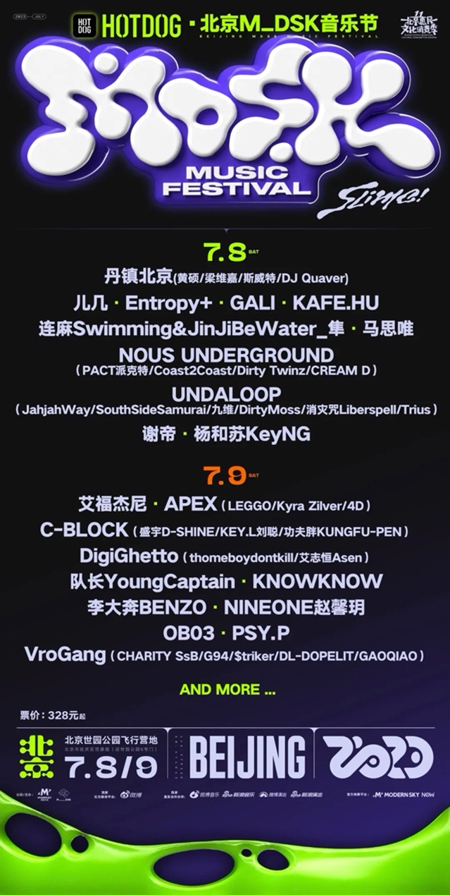 将北京作为2023年的首站,M_DSK音乐节大声喊出「SLIME!」的名字,在呼唤他/她/它的同时,也做好迎接每一位观众的准备,希望你们同样已经准备好走进现场音乐、与节奏一同融化、成为「SLIME!」!M_DSK将为你们带来一场“地地道道”的Hip-Hop音乐节,「SLIME!」在北京就是“ 瓷 , 来 !”,7月08-09日,现场见!