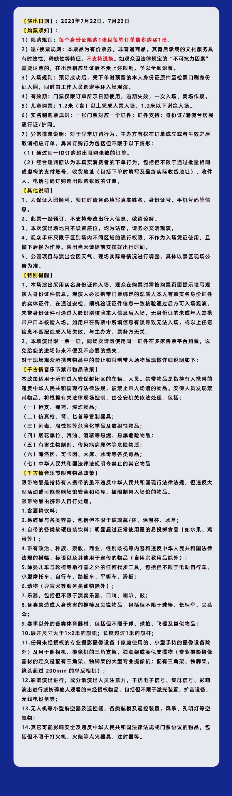 1.演出票品为特殊商品,除不可抗力因素导致演出取消外,订单不支持退换,可在平台转售; 2.演出详情仅供参考,具体以主办方公布信息及现场为准,请准时到场以免错过演出; 3.有票官方确保售出票品真实有效,请放心购买; 4.根据演出火爆情况,有票平台可能会将您所选的快递送票、上门自取等取票方式调整为现场取票,敬请谅解; 5.平台会尽力促使卖家履行交易协议,如果卖家付票过程中发生问题,本平台可协调相同或更高票挡的票品代替,否则平台将全额退款并按订单上约定的赔付方式与金额向用户进行赔付; 6.为了安全起见需要本人签收,演出快递票均为快递费到付(不包邮),请知晓!