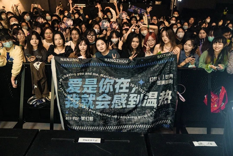 某幻君“幻想( )世界”巡演去年成功在南京及杭州上演,吸引了来自全国各地的粉丝到场。粉丝自发在场内外为某幻君进行应援,无论是签满名字的应援旗,还是粉丝手上的手幅、小卡,无不承载着他们对某幻君的支持与喜爱。