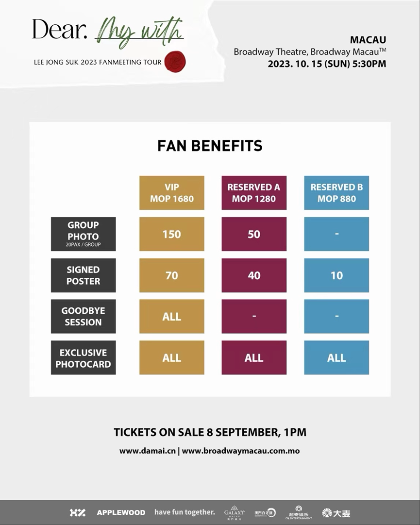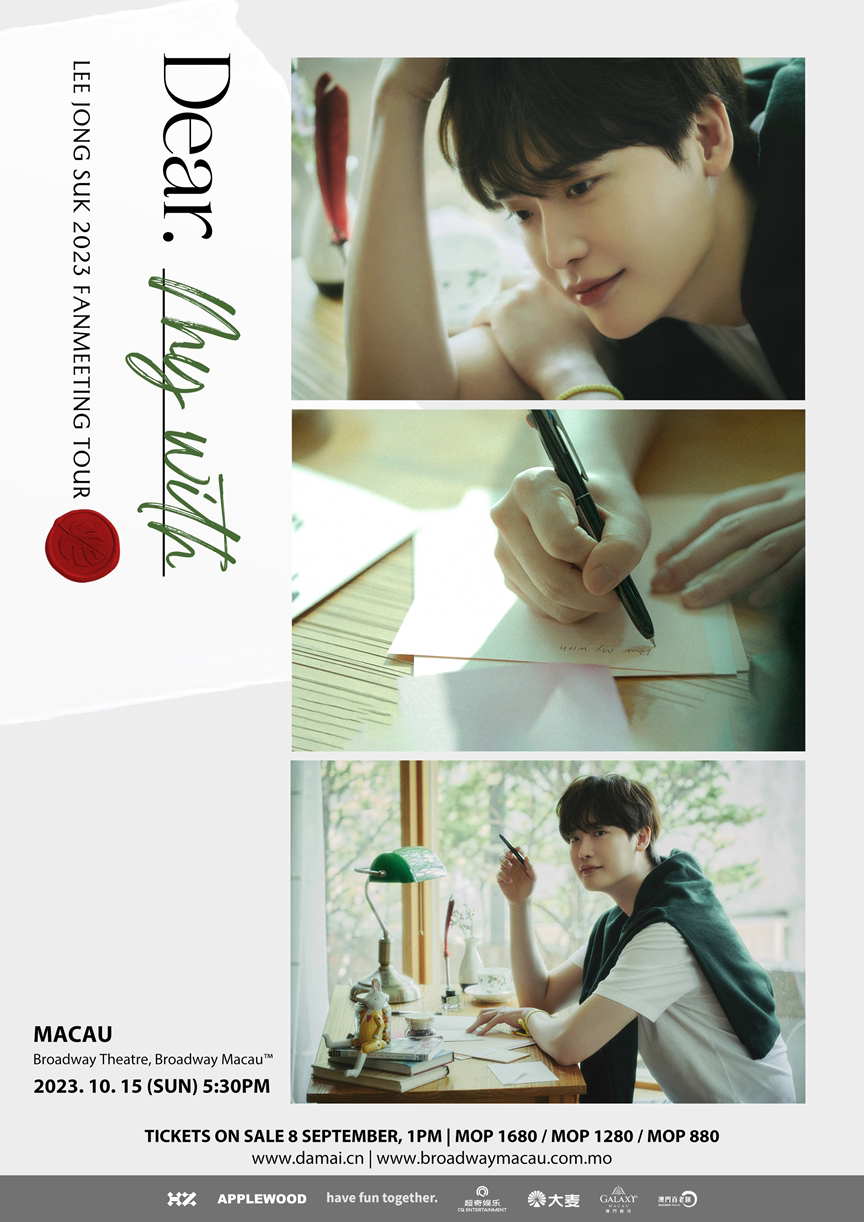 韩国人气演员李钟硕将于10月15日在中国澳门百老汇舞台举行2023粉丝见面会巡演《Dear.My With》澳门站。