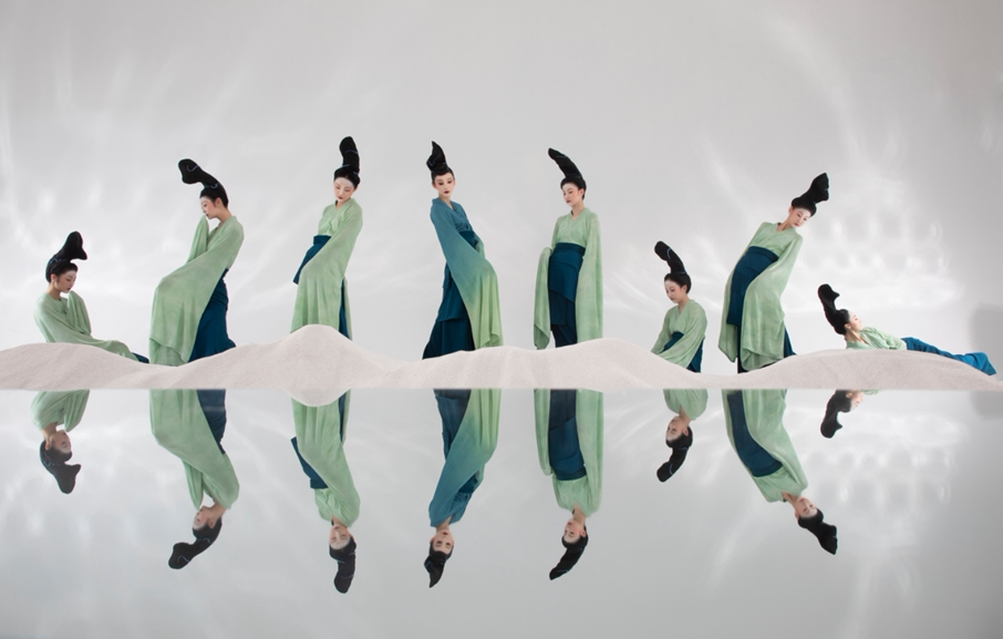 随着灯光与演员的舞动,画中的天地无边、山水无界都在行云流水之间,悄然转化,最终形成气韵生动、让人一眼万年的青绿。