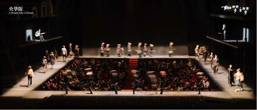 央华版《如梦之梦》是环绕形式的剧场,演出长达约八小时,观众坐在舞台的中央区,三十多个演员、三百多套的衣服,舞台包含八个方位,三个楼层,穿越时间(民国初年、现代)与空间(中国台北、巴黎、上海、北京、诺曼底)。