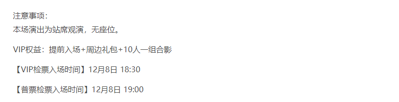 1.演出票品为特殊商品,除不可抗力因素导致演出取消外,订单不支持退换,可在平台转售; 2.演出详情仅供参考,具体以主办方公布信息及现场为准,请准时到场以免错过演出; 3.有票官方确保售出票品真实有效,请放心购买; 4.根据演出火爆情况,有票平台可能会将您所选的快递送票、上门自取等取票方式调整为现场取票,敬请谅解; 5.平台会尽力促使卖家履行交易协议,如果卖家付票过程中发生问题,本平台可协调相同或更高票挡的票品代替,否则平台将全额退款并按订单上约定的赔付方式与金额向用户进行赔付; 6.为了安全起见需要本人签收,演出快递票均为快递费到付(不包邮),请知晓!